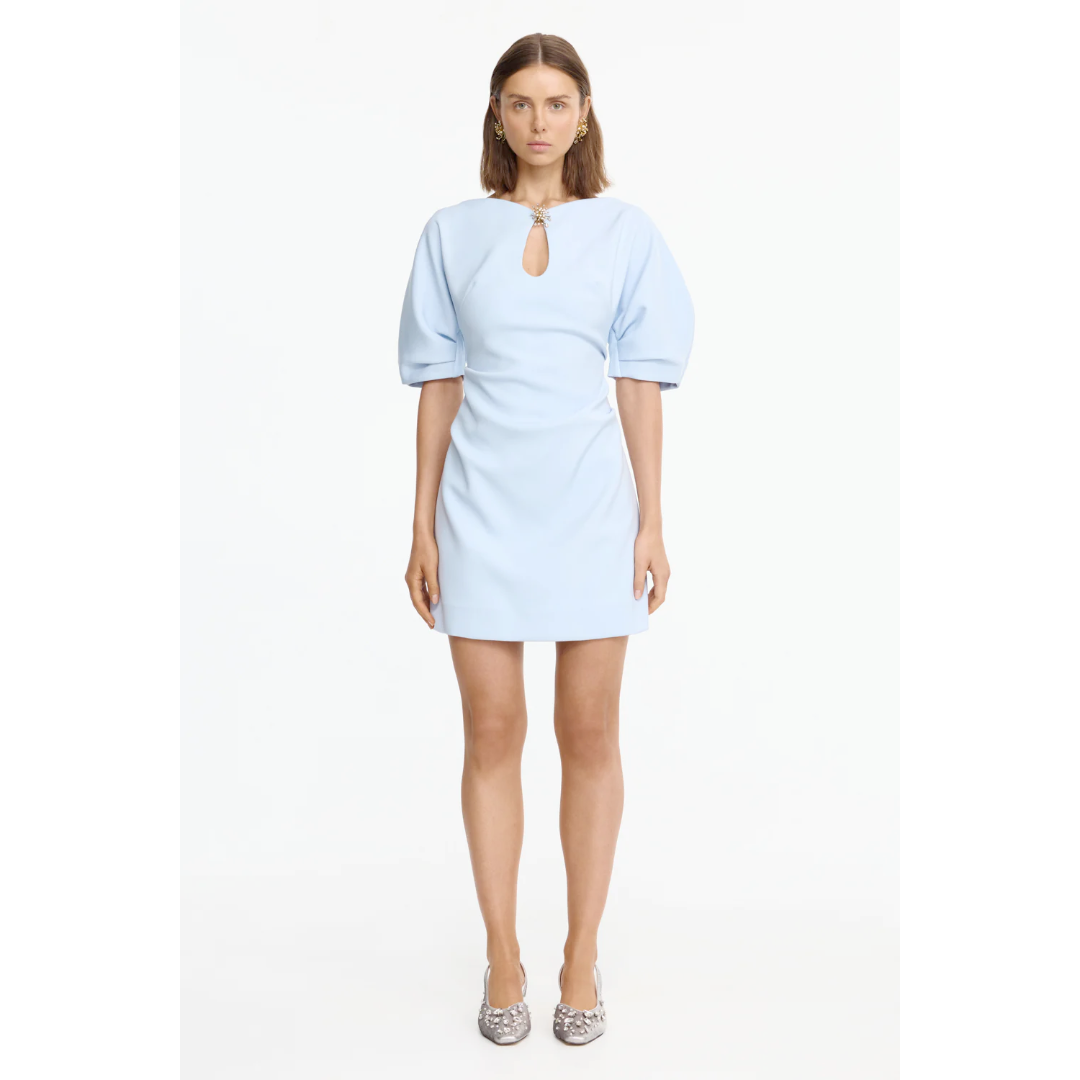 The Dingsey Mini Dress in Bluestar commands attention with its fitted silhouette and subtle detailing. The smooth, bonded fabric shapes the body with structure, while a keyhole neckline is finished with gold hardware and rhinestones. Slight puff sleeves add a fun touch, making this dress ideal for both casual and semi-formal styling.