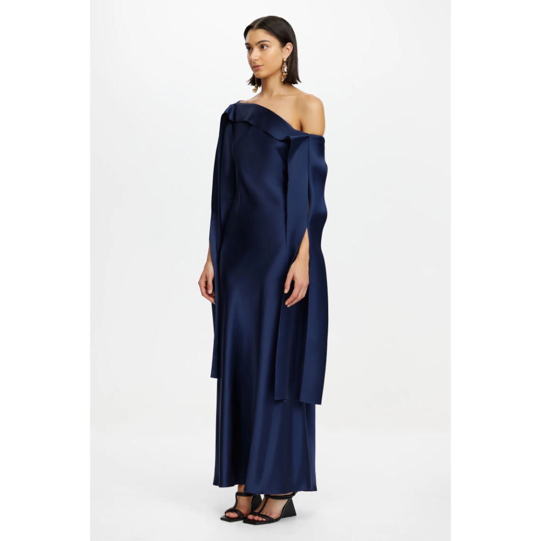 The Linhope Maxi Dress in Deep Sapphire is a refined expression of modern elegance. Crafted from luxe woven satin, this silhouette features a soft asymmetric neckline and dramatic off-shoulder drape. A long, folded sleeve detail adds sculptural fluidity, while the back invisible zip ensures a seamless fit. A sophisticated choice for evening occasions.