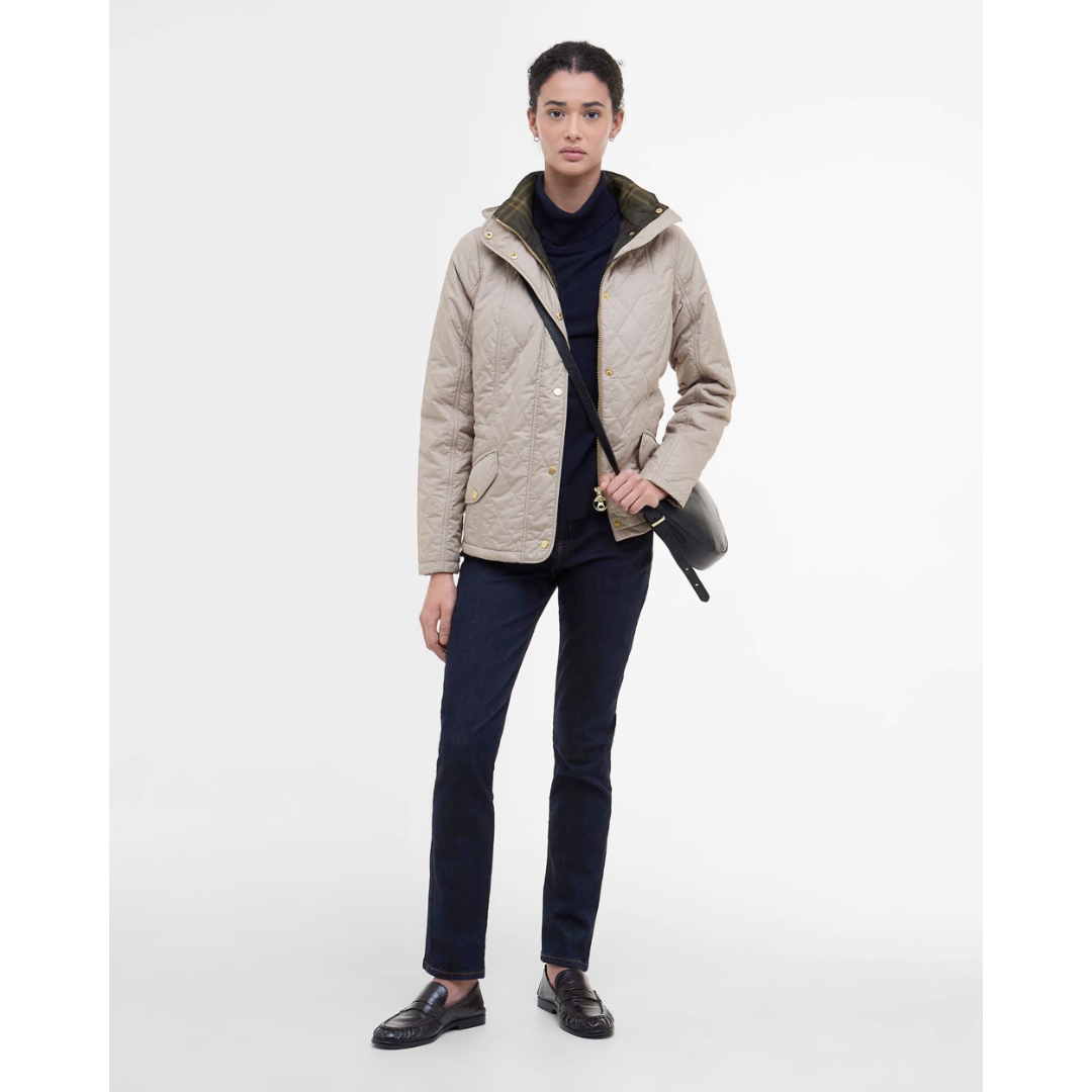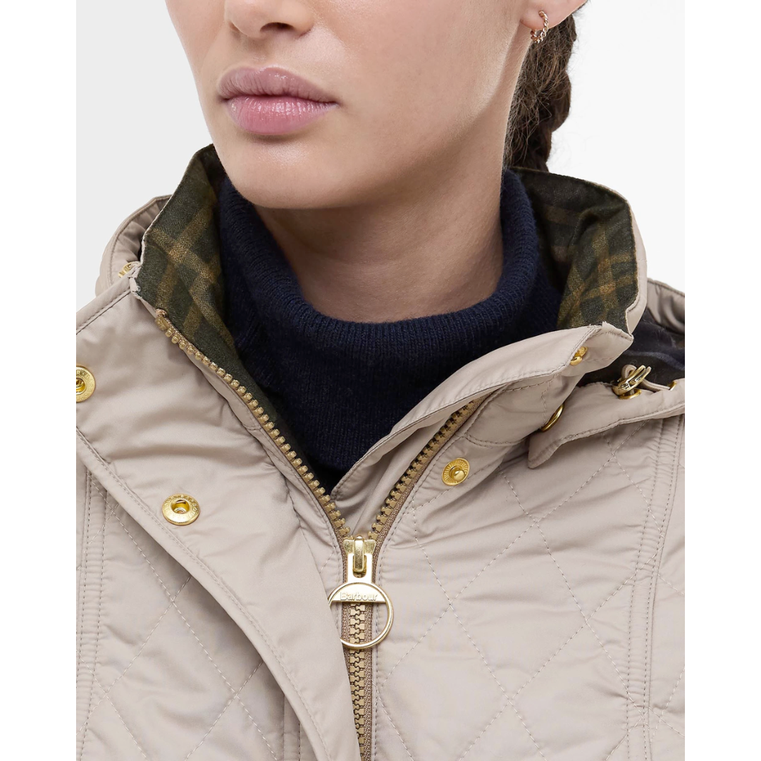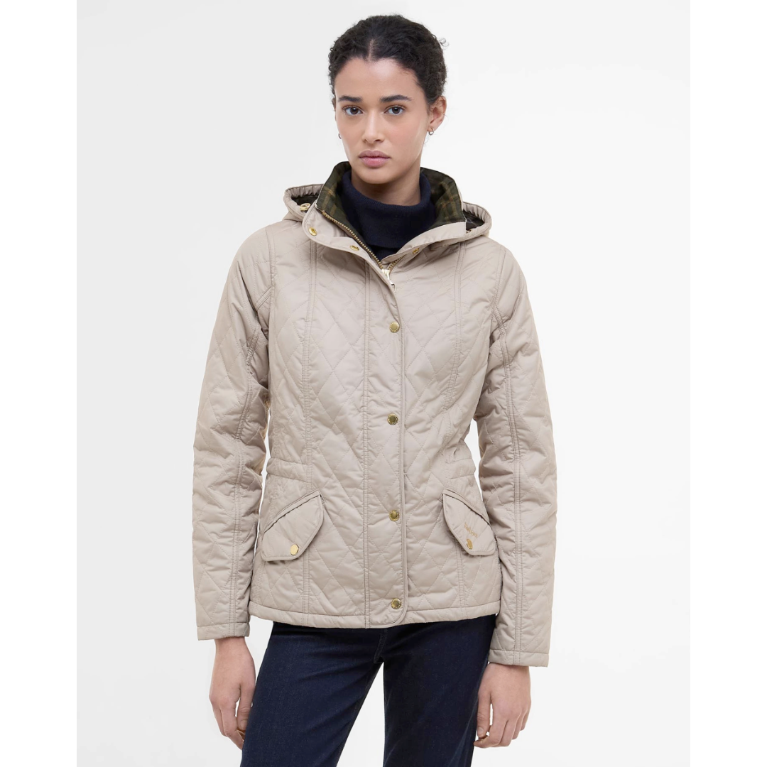 Cut to a flattering, feminine silhouette, this chic quilted jacket is perfect for the cooler months. Featuring a detachable hood and a concealed waist drawcord for the perfect fit, the lining holds Barbour tartan for a classic finish.