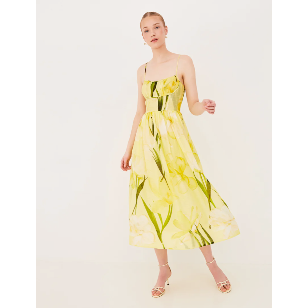 • Midi length fit-and-flare with adjustable spaghetti straps and ruched bodice