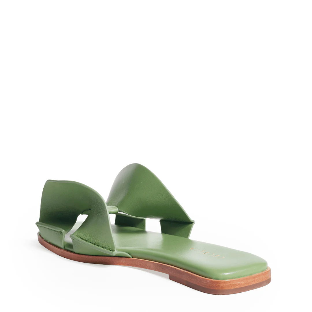The Wendy sandal in soft green leather brings relaxed elegance to a modern flat silhouette. Crafted in smooth cushioned leather, this design features an oversized sculptural bow that softly wraps across the foot, creating a bold yet effortless statement. The fresh green tone acts as a perfect neutral—grounded, versatile, and ideal for adding a subtle pop of color to everyday styling.
