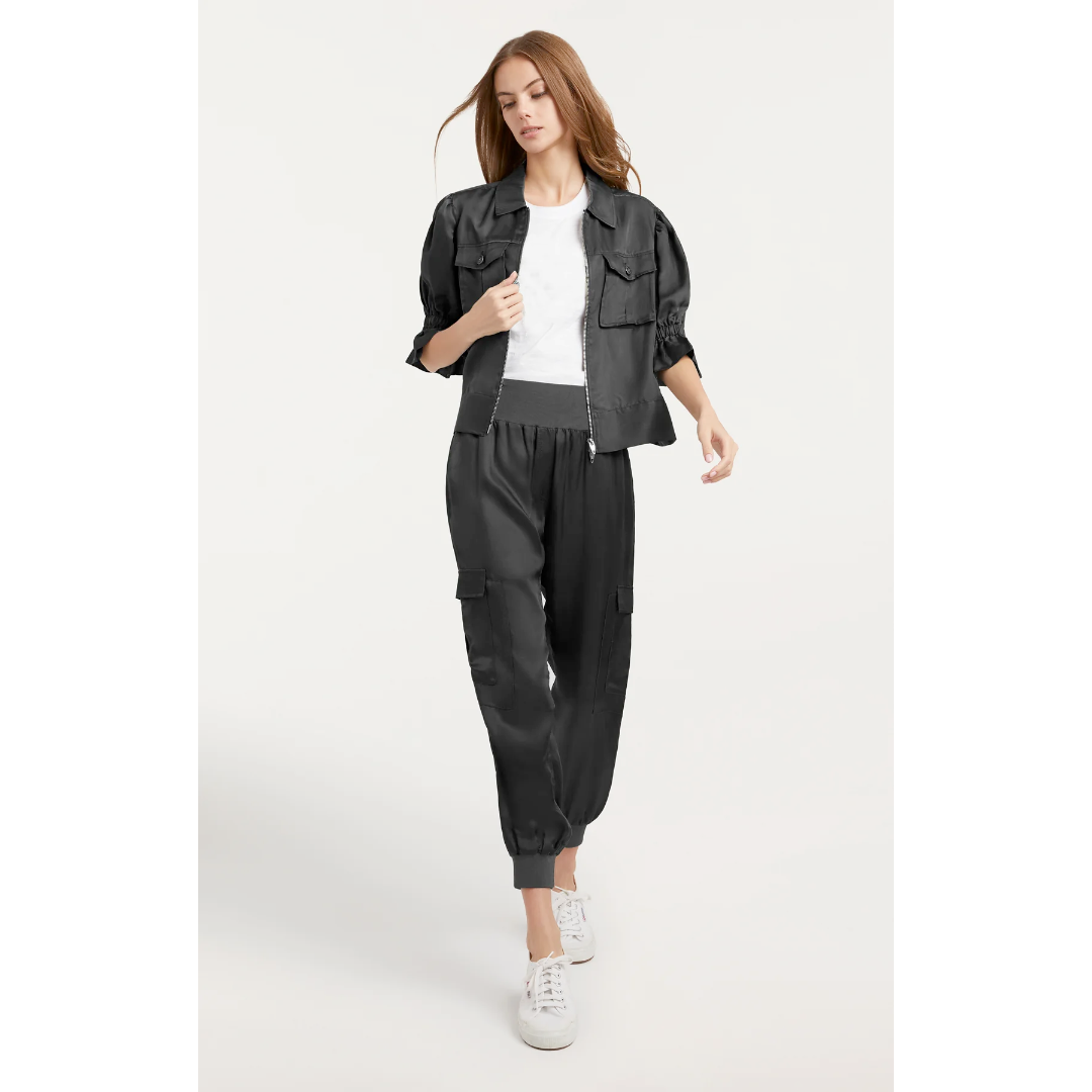 Experience comfort and style with the Holly Jacket. This short-sleeved jacket features a collared neckline and sleek black design, perfect for any occasion. Made with cupro fabric and complete with an exposed zipper and patch pockets, it's the perfect combination of fashion and functionality.