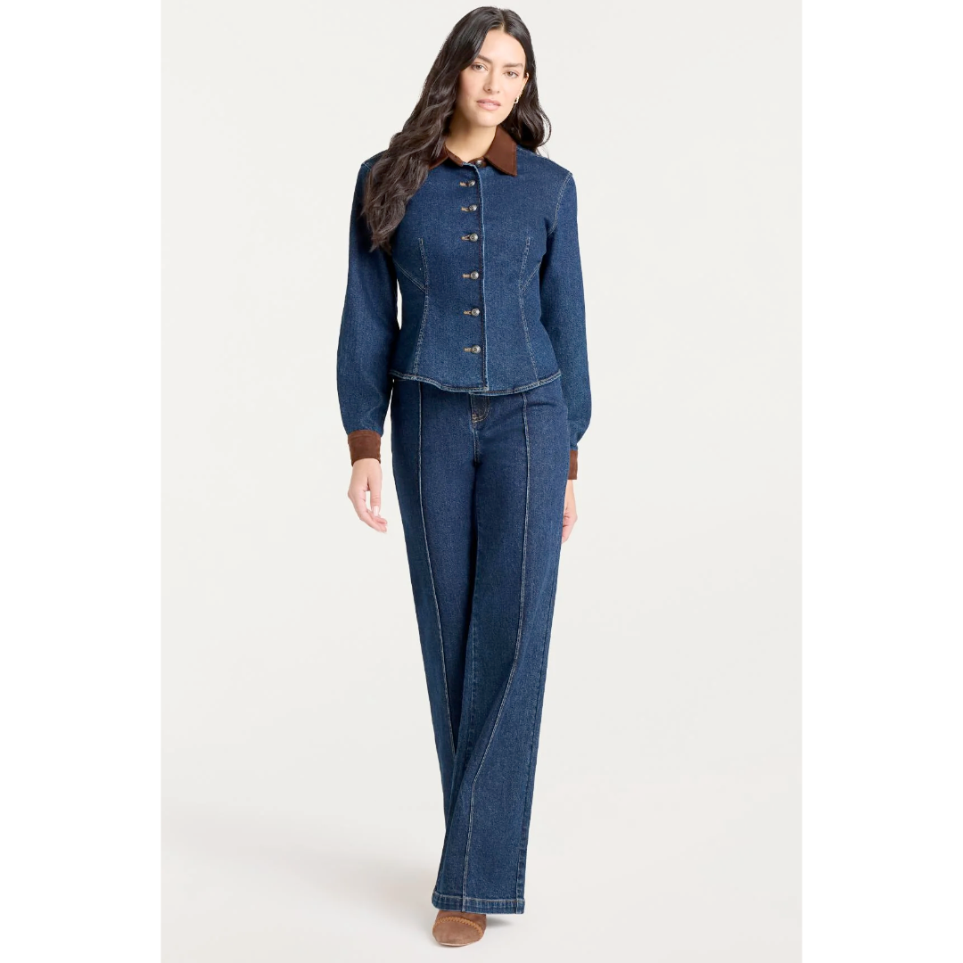 Double button and fly zipperFabric: Indigo DenimStraight silhouettePatch pocket detailsCropped length