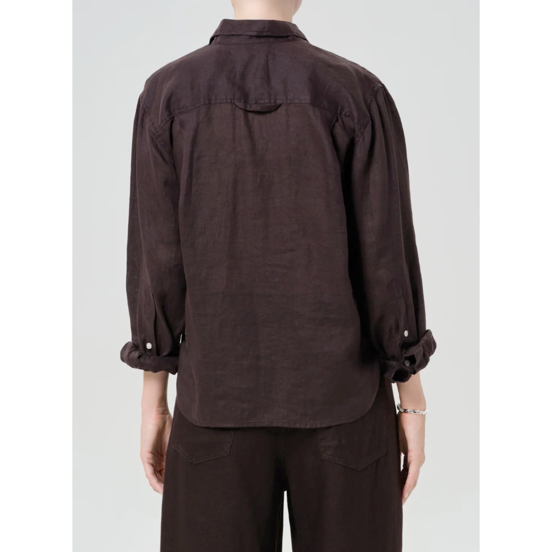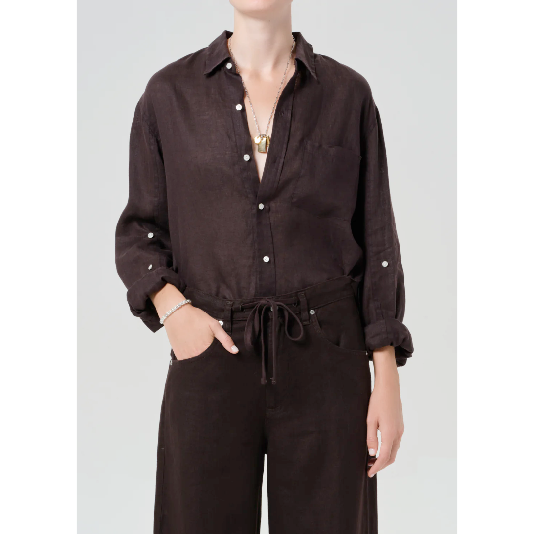 Looks Like: Deep dark brown linen long sleeve collared button front shirtFeels Like: Breathable lightweight linen