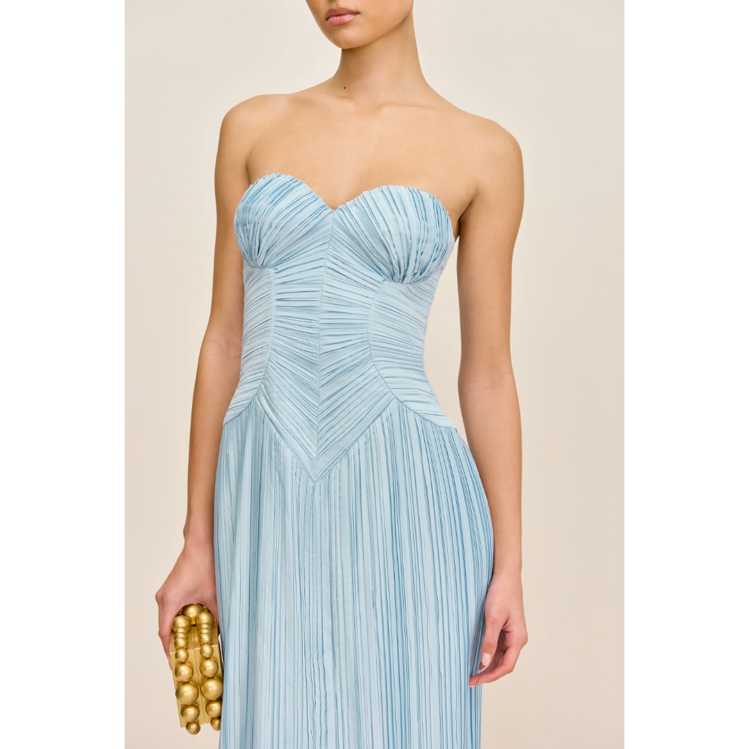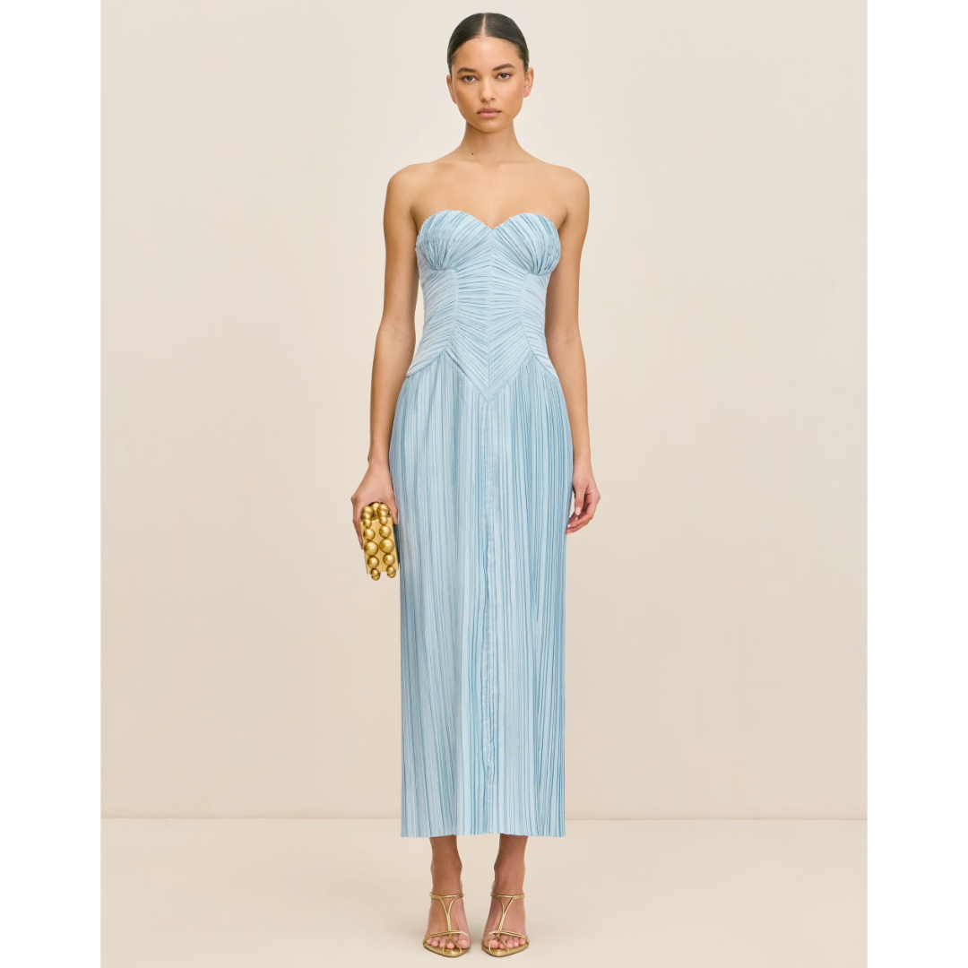 A plissé midi-length dress with a sweetheart neckline and a structured corset bodice for an ultra-slimming effect.