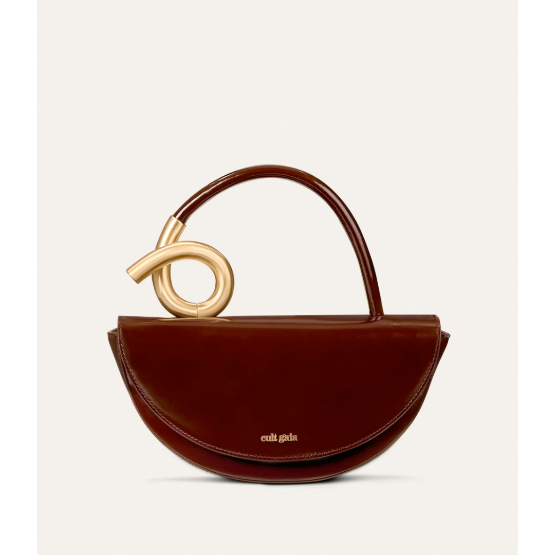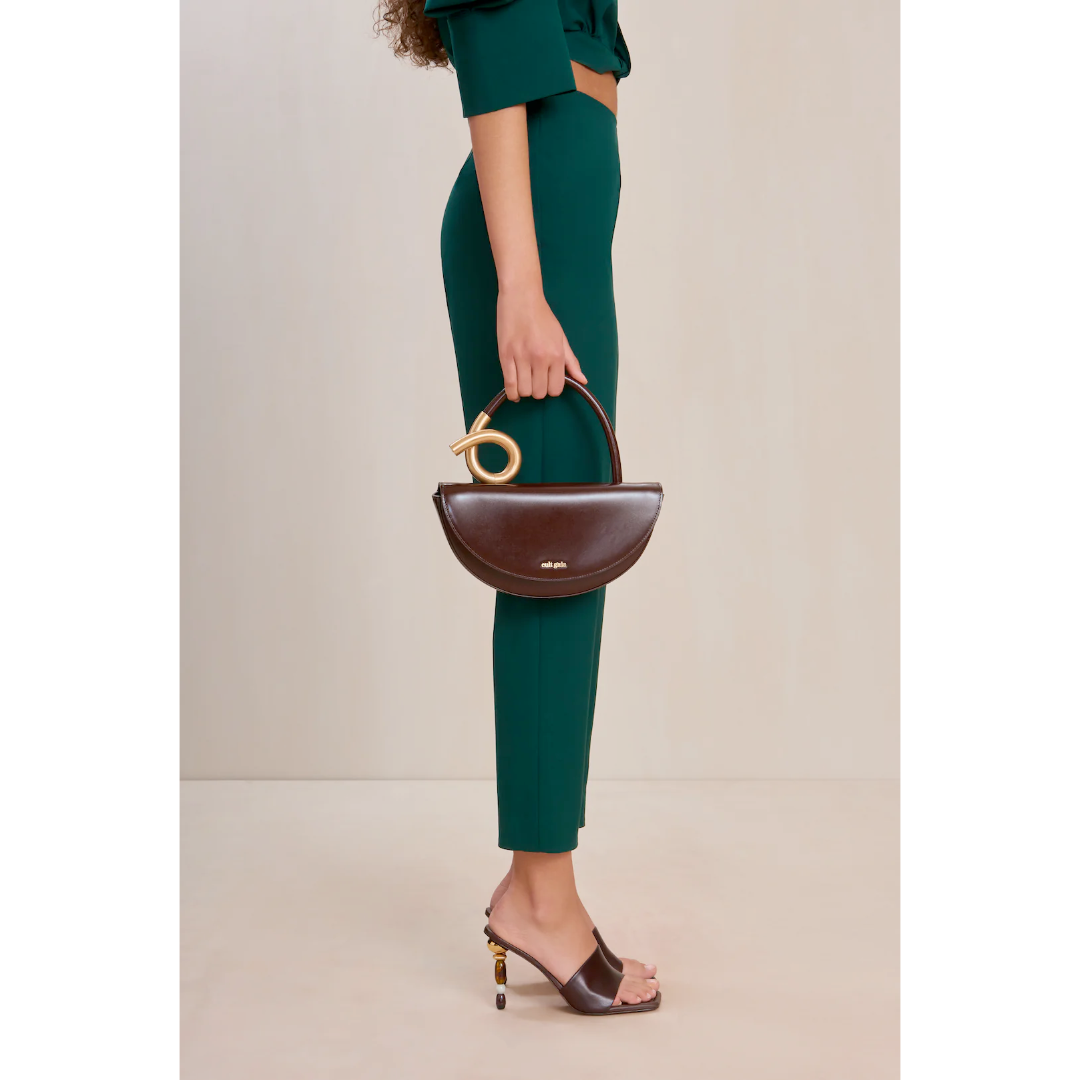 The top-handle silhouette is designed in a half moon shape and detailed with sculptural brass hardware that coils at the handle.