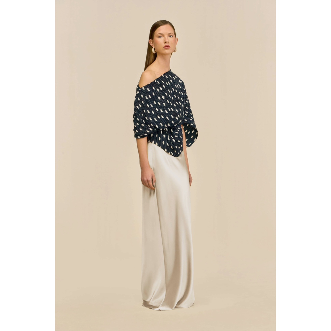 An asymmetrical, shoulder-baring top gathered at the waist and designed in voluminous paneling of mini-pleated plissé.
