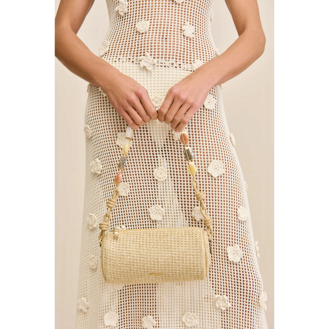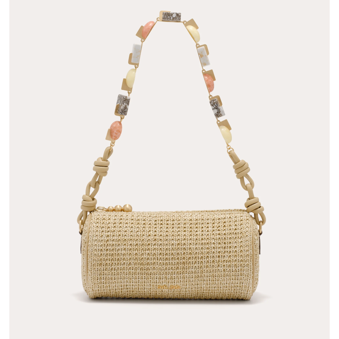 • A vacation-ready raffia shoulder bag featuring a strap adorned with faux stones.