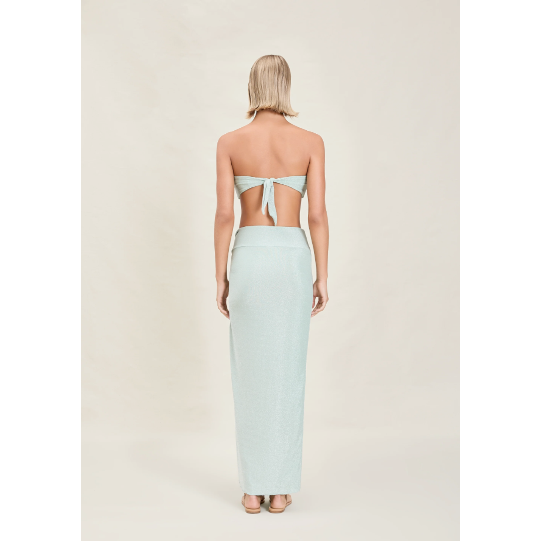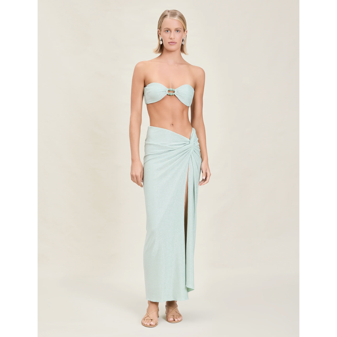 The Gwen is a skirt-sarong with a high slit, knot detail, and can be worn high-waisted or low rise.