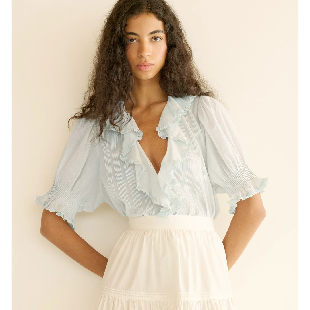 Crafted from soft organic cotton voile, the Edwardian-inspired Henri Top is a Favorite Character we find ourselves returning to again and again. It features a plunging V-neckline framed with cascading lace-trimmed ruffles that extend down the bodice and delicate clustered pintucks at the yoke, back, and short puffed sleeves. A line of hidden starburst buttons run up the center front. Wear it loose, or tuck it into your favorite high-waisted jeans.