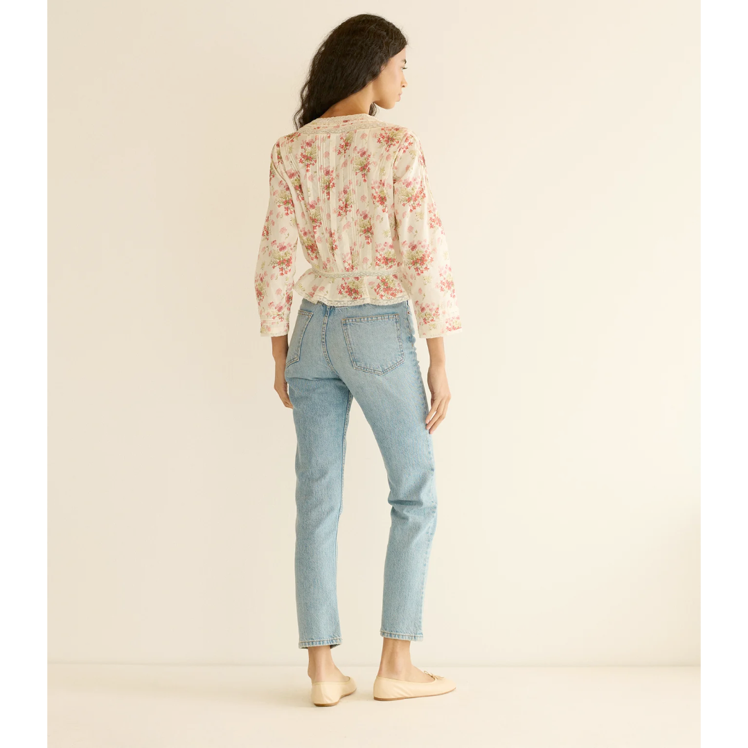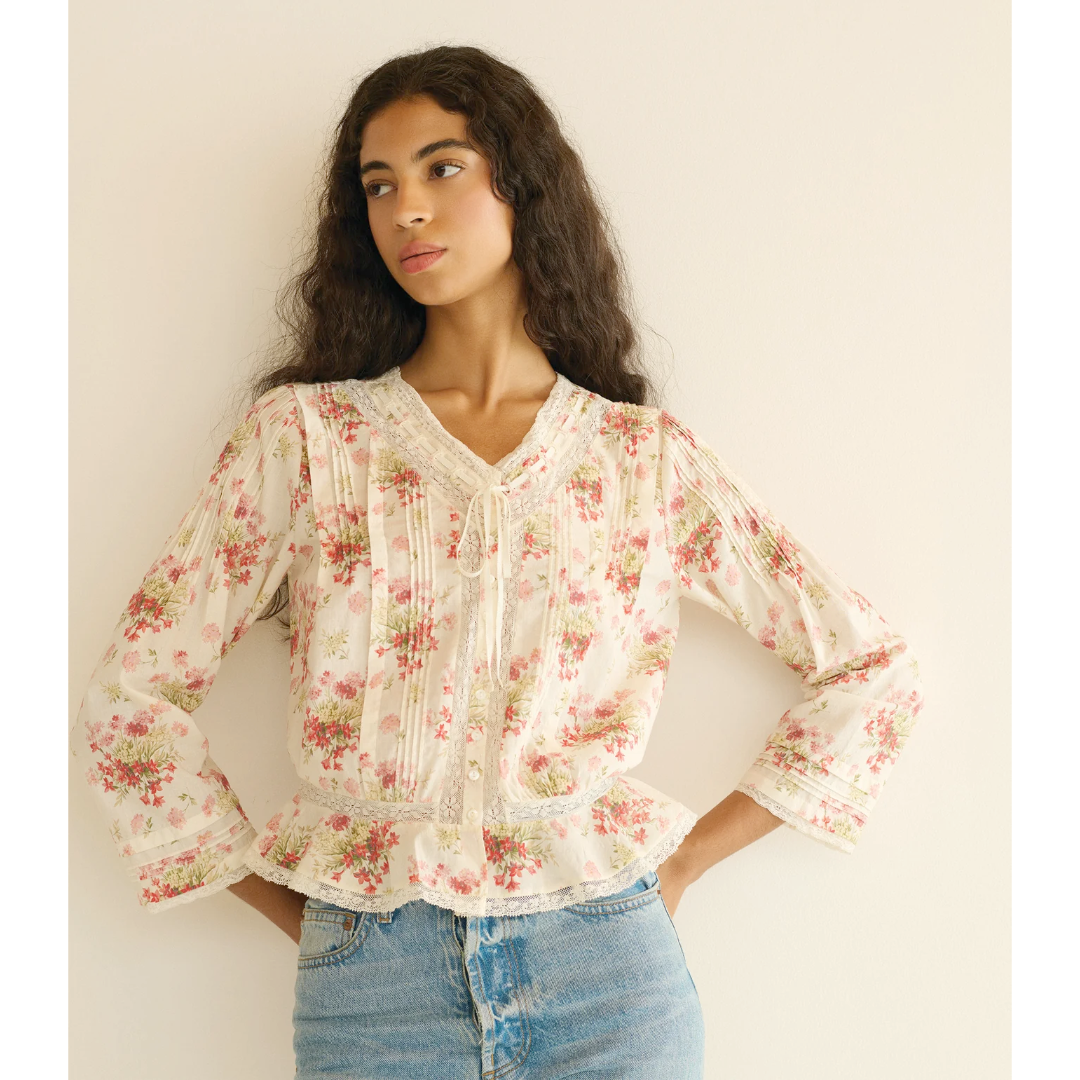 In soft organic cotton voile patterned with our Lantana Floral, the Hillock Top is a long-sleeved update to our beloved Traveler Top. Designed with a slightly cropped peplum silhouette, it’s finished with Edwardian-inspired details throughout, like clustered pintucks, delicate ladder trim, and scallop eyelets. A high V-neckline is threaded with a grosgrain ribbon tie, and a line of mother-of-pearl buttons runs down the front.