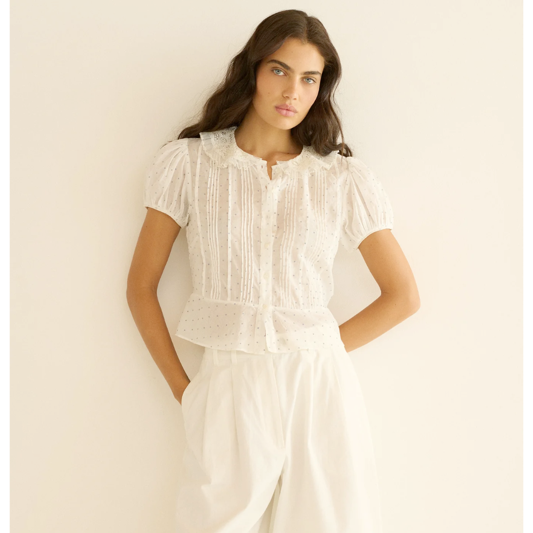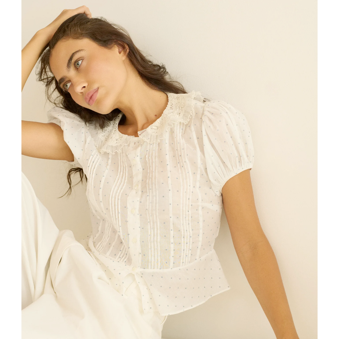 Crafted from soft organic cotton voile patterned with pale blue flockdots, the Oleta Top is graced with vintage details. It features clustered pintucks and a Peter Pan collar framed with intricate Battenberg lace and pleated organza tulle, with a line of mother-of-pearl buttons extending down the center front.