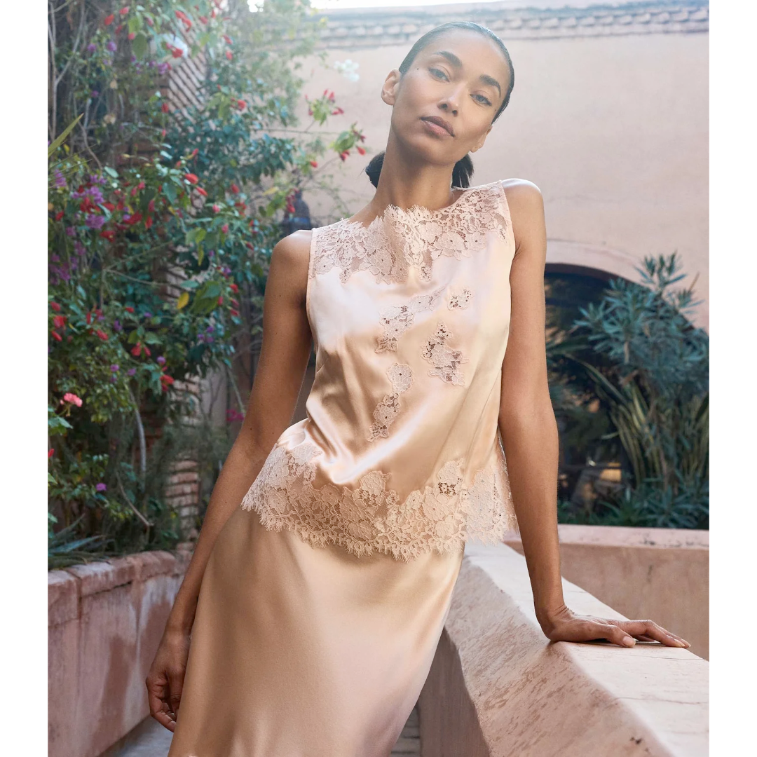 Made from buttery silk satin, the Viviane Top features a relaxed, boxy silhouette adorned with intricate floral lace at the high bateau neckline, bodice, and hem.