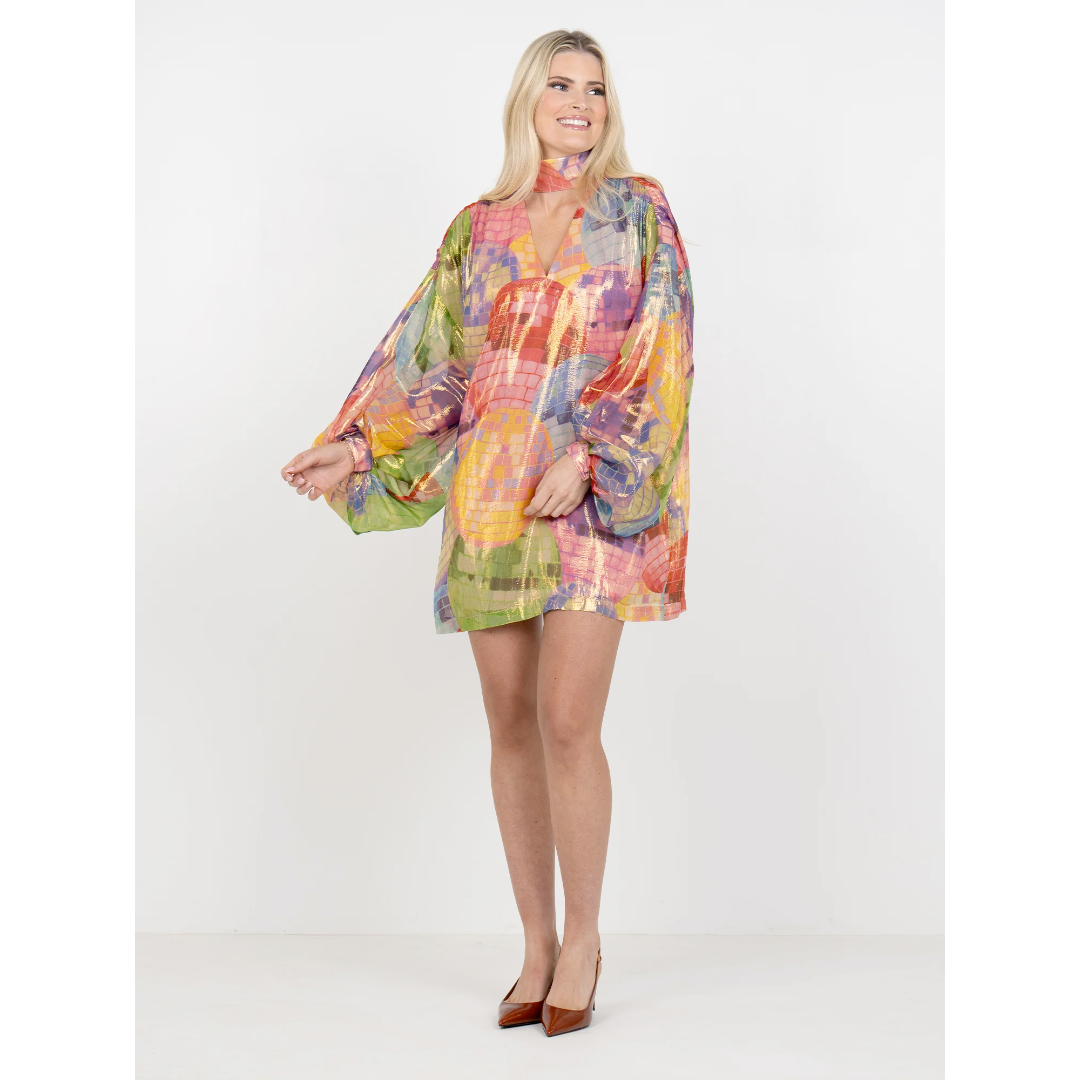 The Sasha Mini in Disco is designed for movement and shine, featuring a keyhole neckline, dramatic blouson sleeves, and a relaxed silhouette. Crafted in a shimmering silk with a vibrant disco ball print, this dress is the ultimate party-forward piece—made to light up the dance floor and turn every moment into a celebration.