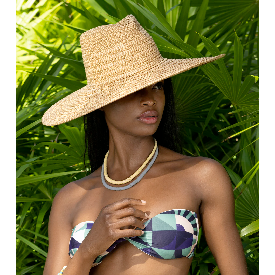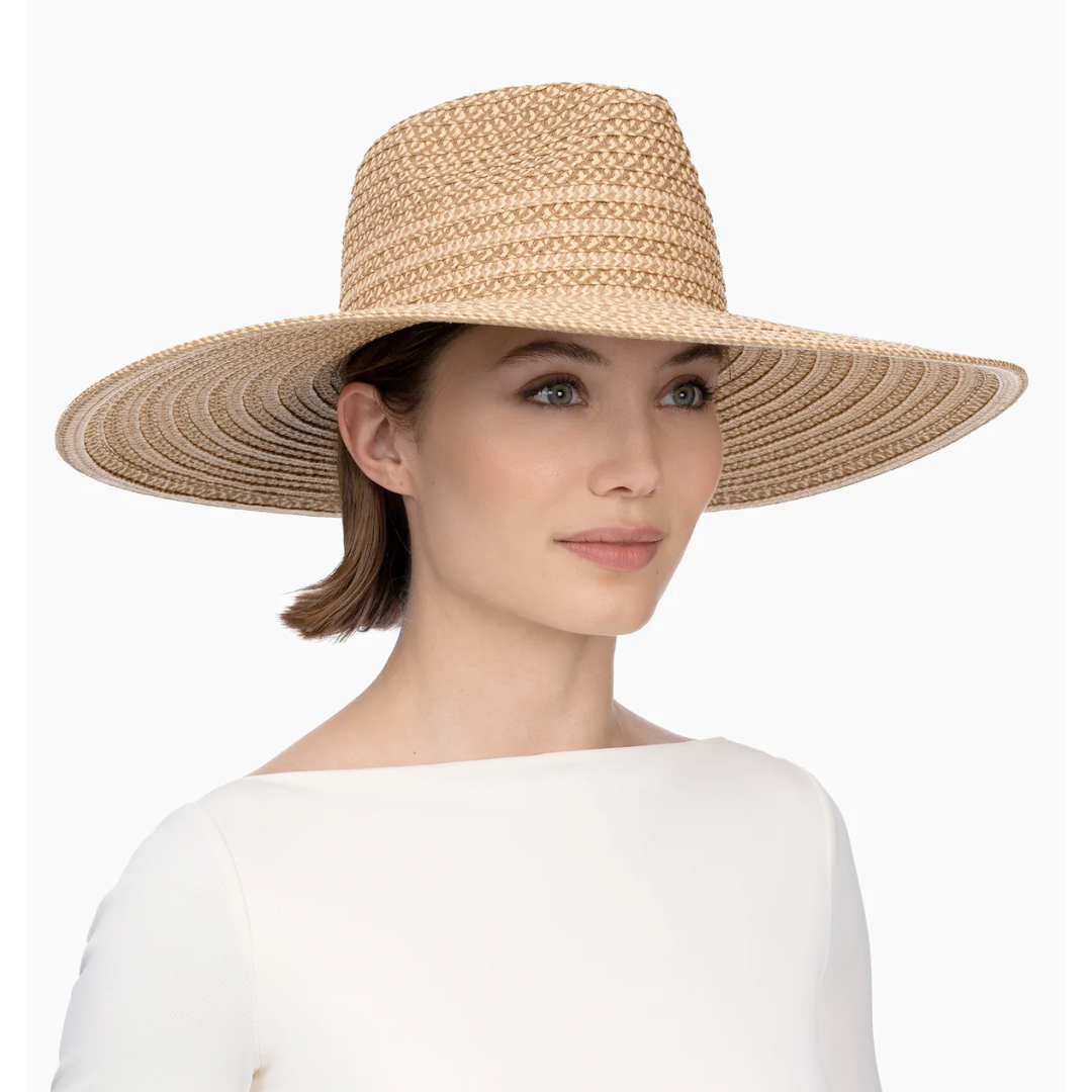 A maritime-inspired fedora made of Squishee® is perfect to use for sun protection in a resort setting where having style matters.This designer Women’s hat for sale online, with its large, contrast striped dip brim and tall elegant fedora crown, has flare to spare!