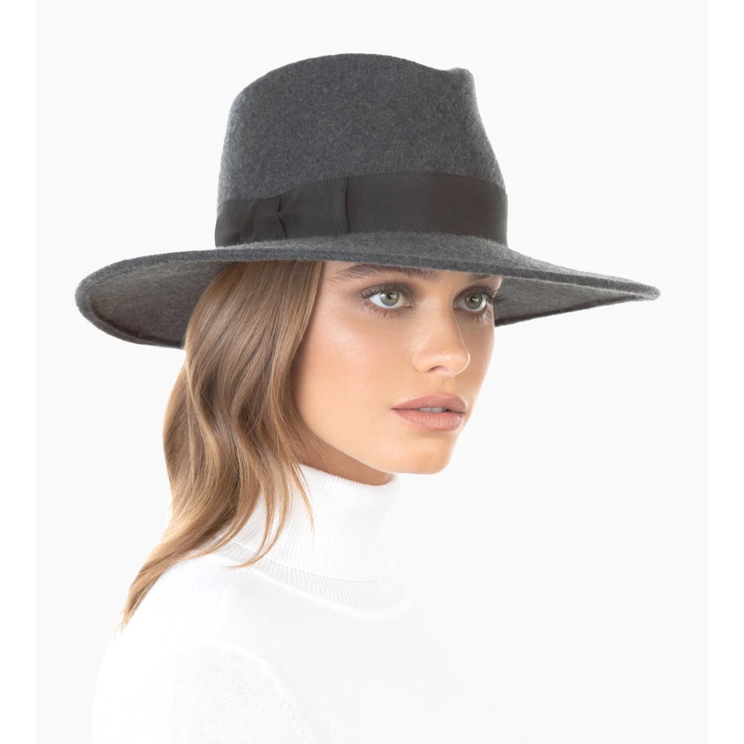 The Wool Zora, a design that reflects timeless elegance is Javits' signature fedora for Fall. Hand-blocked with water-repellent wool felt it will keep your head comfortably warm and dry throughout the fall-winter months. They trim a classic band of grosgrain ribbon finishing to one side with a man-tailored bow. The graceful curve of the crown sculpted by Javits' artistic hands add balance and harmony to a women's face. Sustainable wool is shorn and milled from multi-use sheep that are well cared for on small farms.