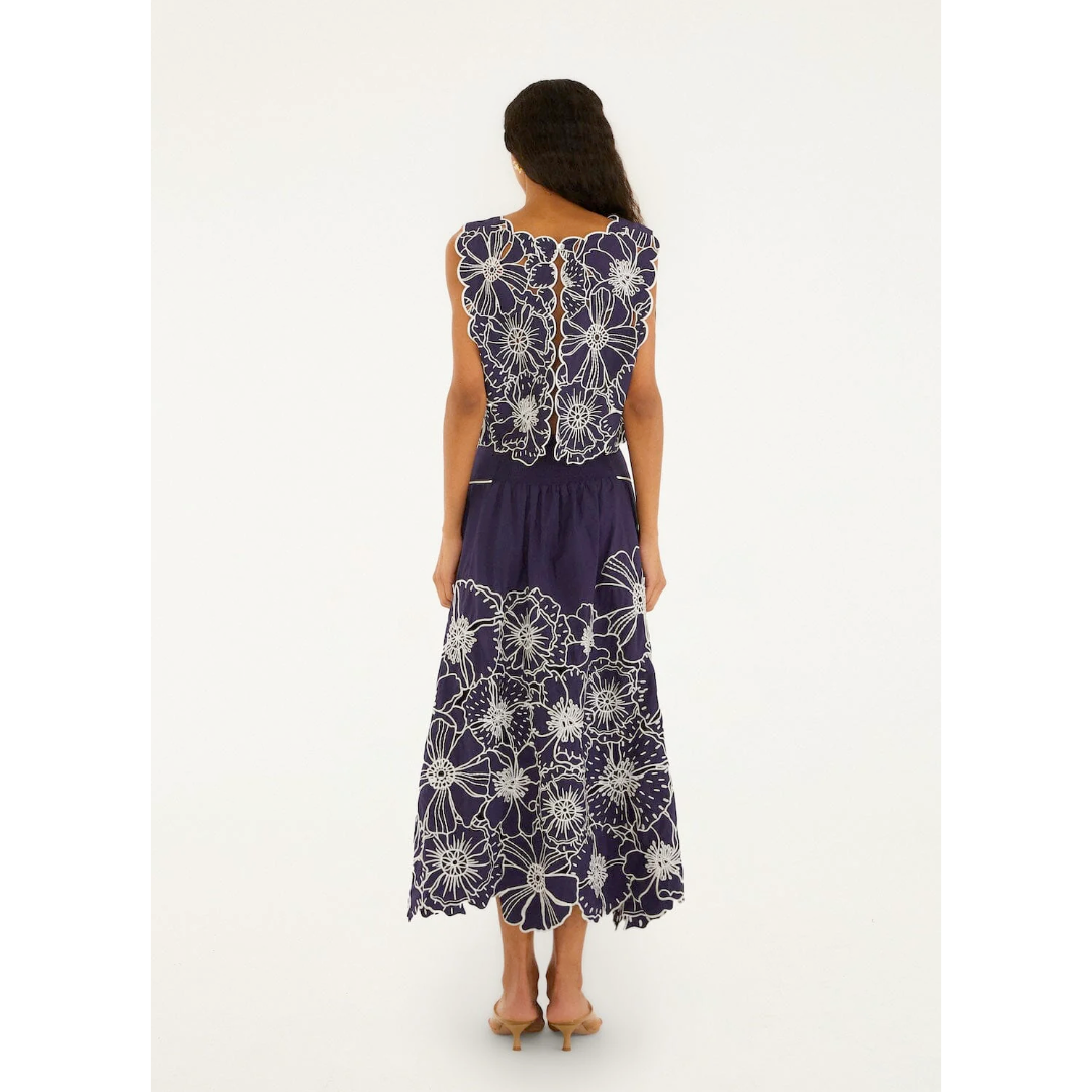 Embrace the vibrant spirit of FARM Rio with this Blue Flowers Richelieu Organic Cotton Maxi Skirt. Crafted from breathable organic cotton, it showcases delicate Richelieu embroidery that dances along the hem, paired with cheerful blue floral patterns. The flowing silhouette gently sways with every step, offering effortless elegance and playful movement. This skirt feels like a warm breeze, perfect for days when comfort meets joyful expression.