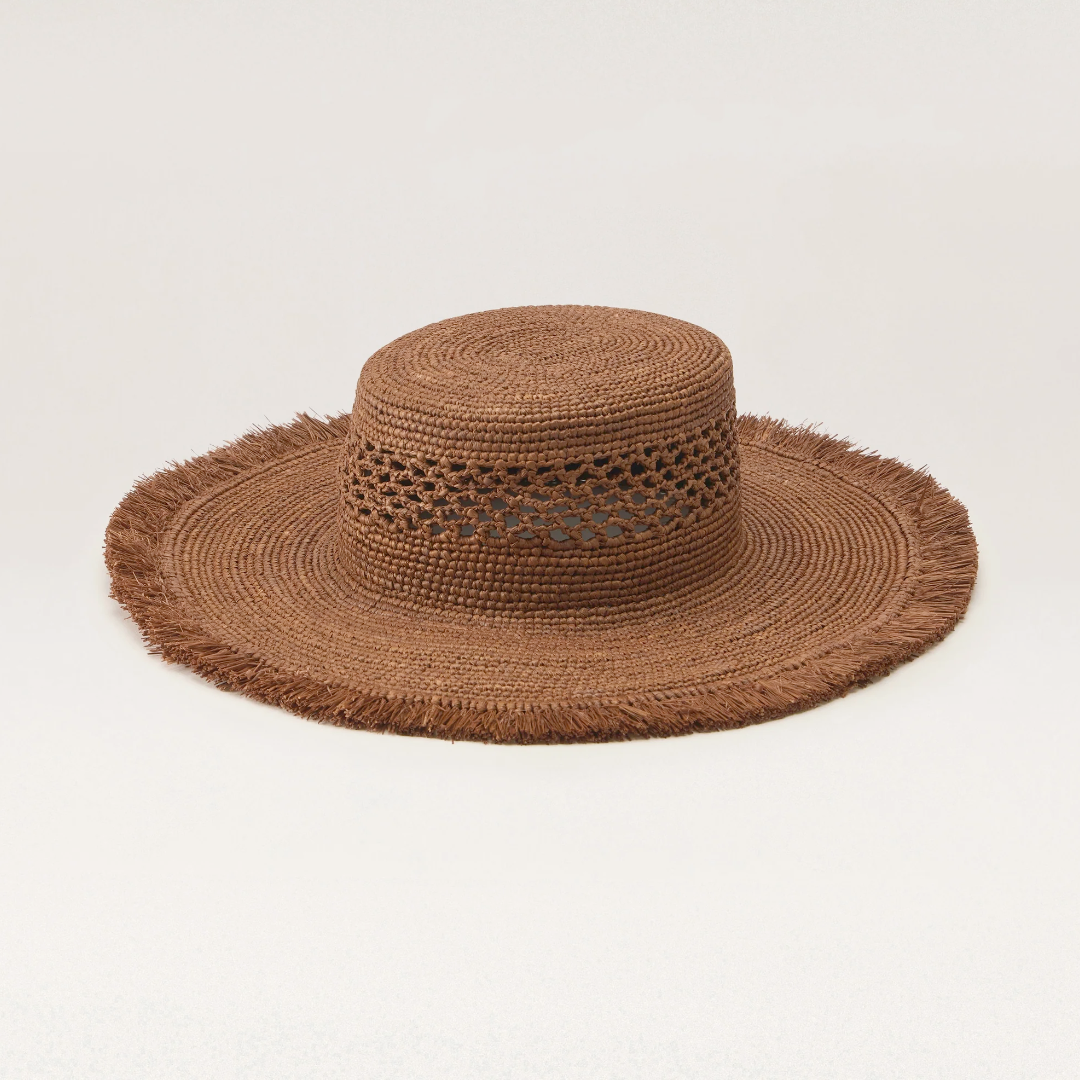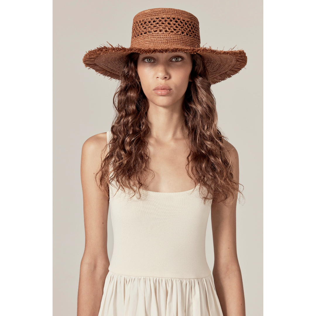 A striking balance of structure and texture, the Ivy Raffia Boater is defined by its tall 9cm crown and wide 11cm fringed brim. Handcrafted in raffia crochet with Daelis stitch detailing at the crown, make a statement on sun-drenched days.