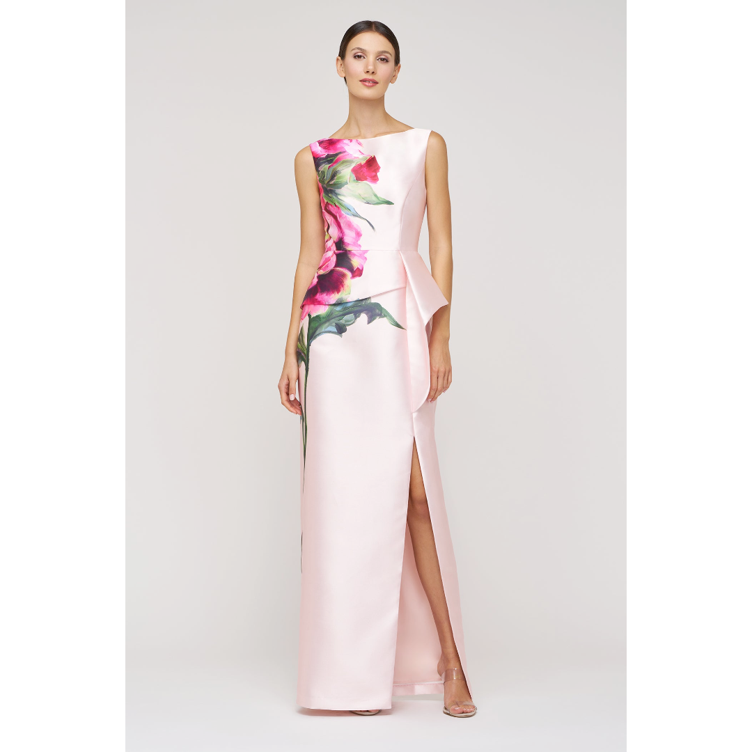 Printed mikado column gown featuring the Eden Rose floral motif in soft, rosewater tones. Designed with an asymmetric back neckline, soft peplum overlay, and a sharp front slit for movement. A polished winter pick for gallery nights or seasonal soirées.