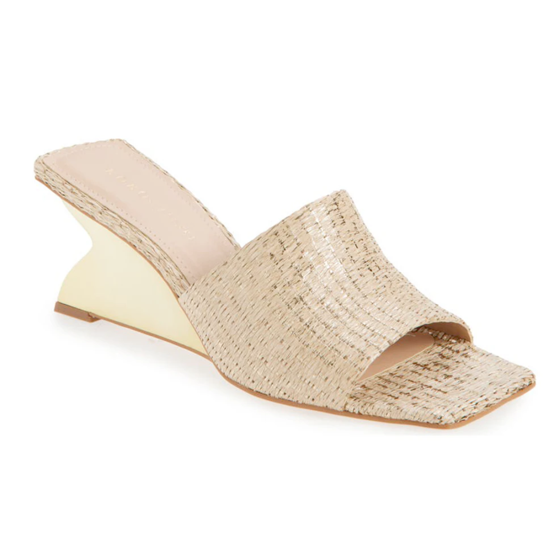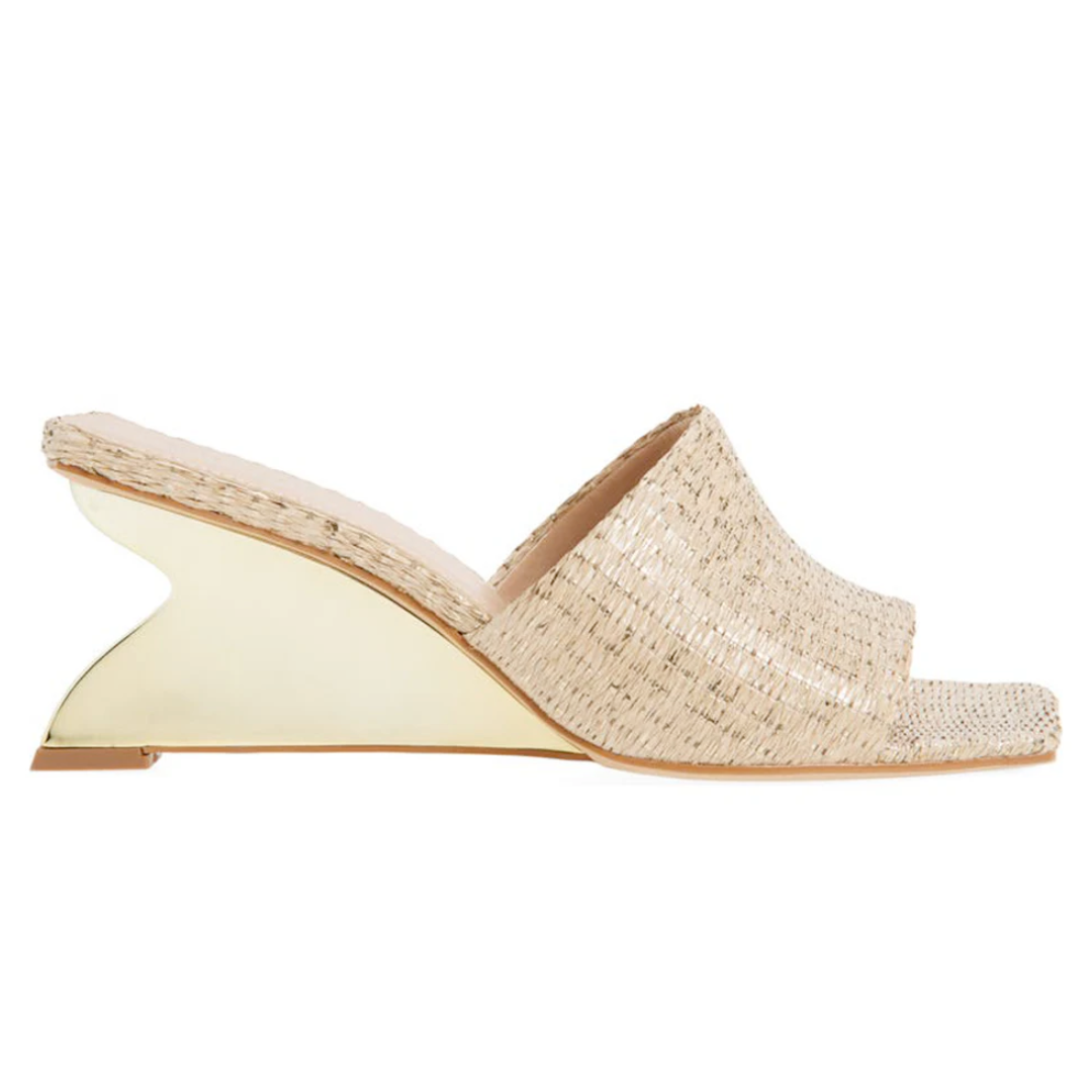 Shimmering texture meets sculptural design in this statement slide sandal. Crafted with metallic woven upper, this open toe style features a sleek slip-on silhouette and a distinctive curved wedge heel that offers comfortable lift while adding a visual interest. Perfect for warm weather occasions, it pairs with dresses, tailored pants and elevated casual looks.