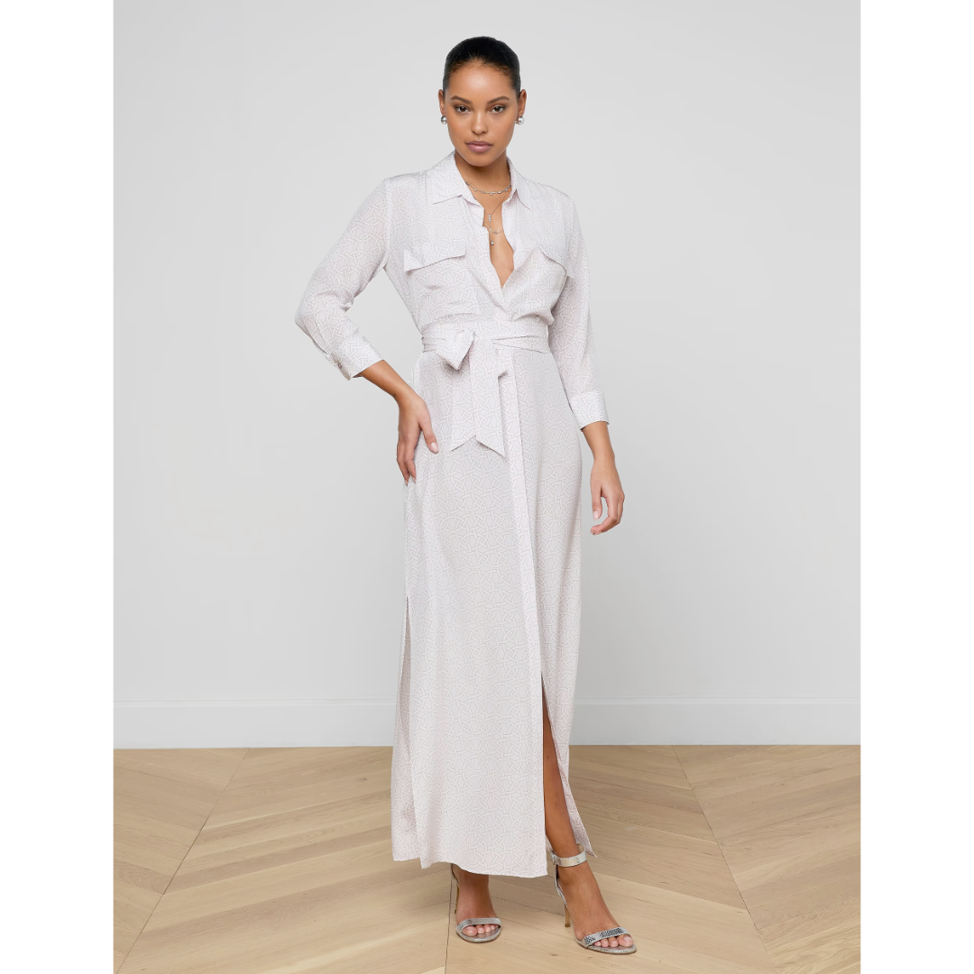 Deep side slits encourage dramatic movement on our all-time bestselling silk shirt dress, now back in lilac with a subtle geometric print. Wear the Cameron on its own or as a duster with jeans and a camisole.