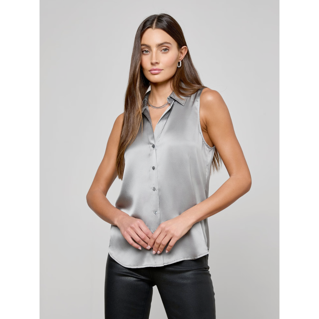 Your essential sleeveless silk blouse, with classic shirting details and an effortlessly relaxed fit. Perfect for office to evening and now back in gray.