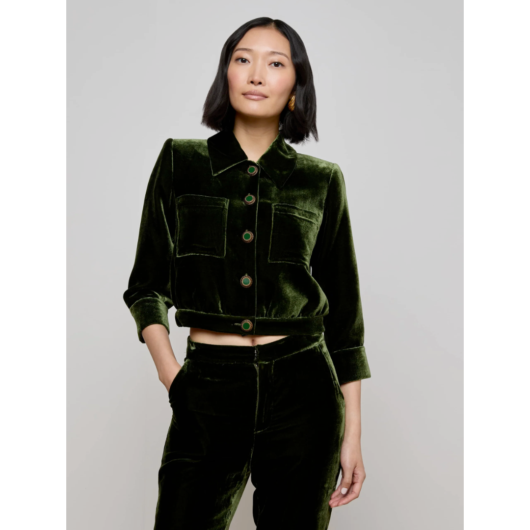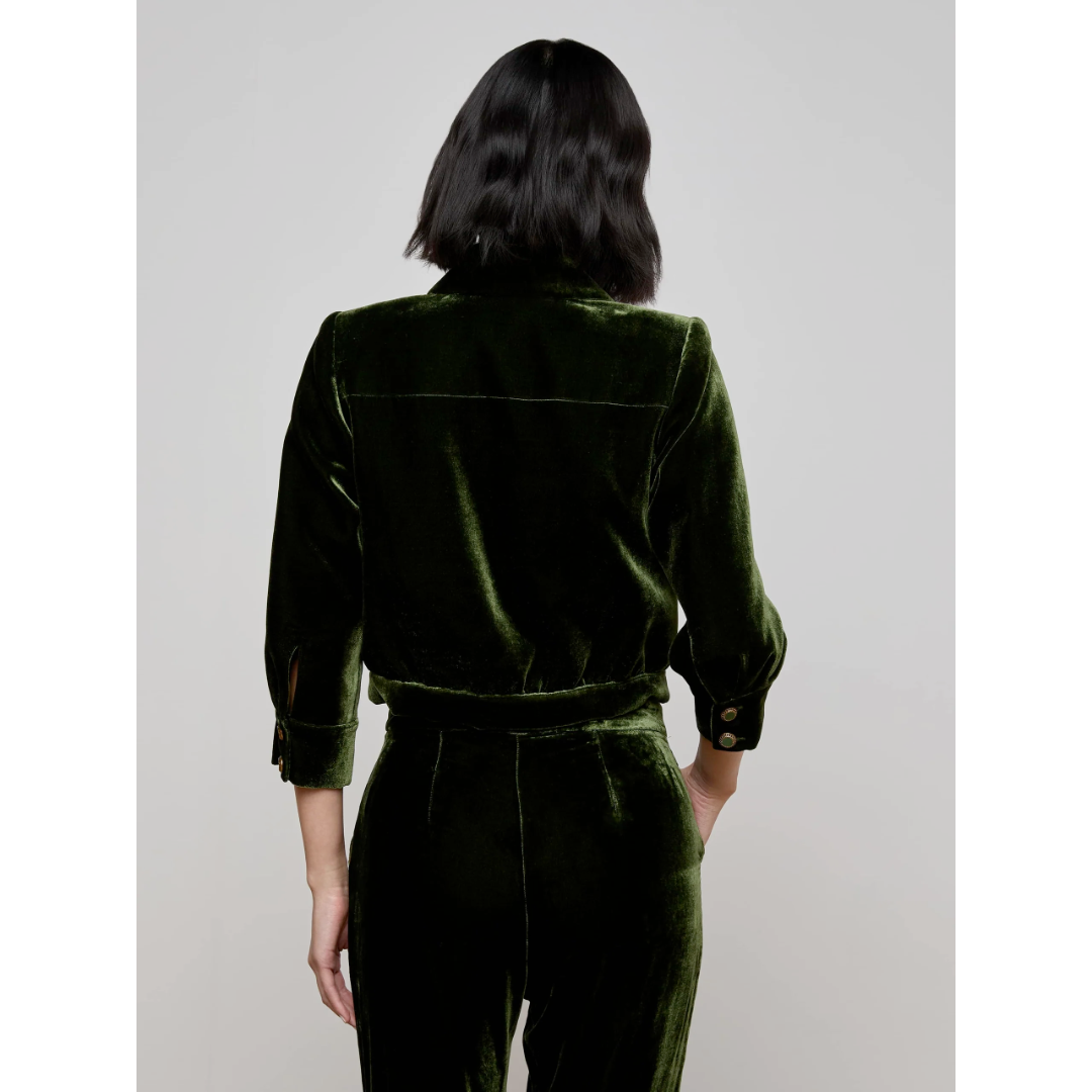 A ladylike, three-quarter sleeve jacket crafted from plush olive green velvet and finished in a chic, cropped length. Wear the Jia as a top or second layer.