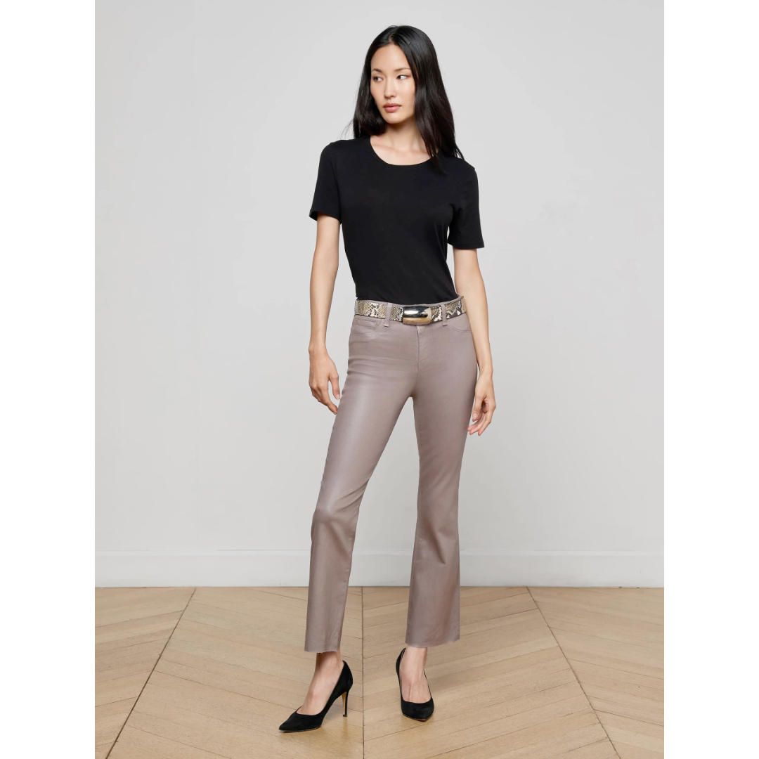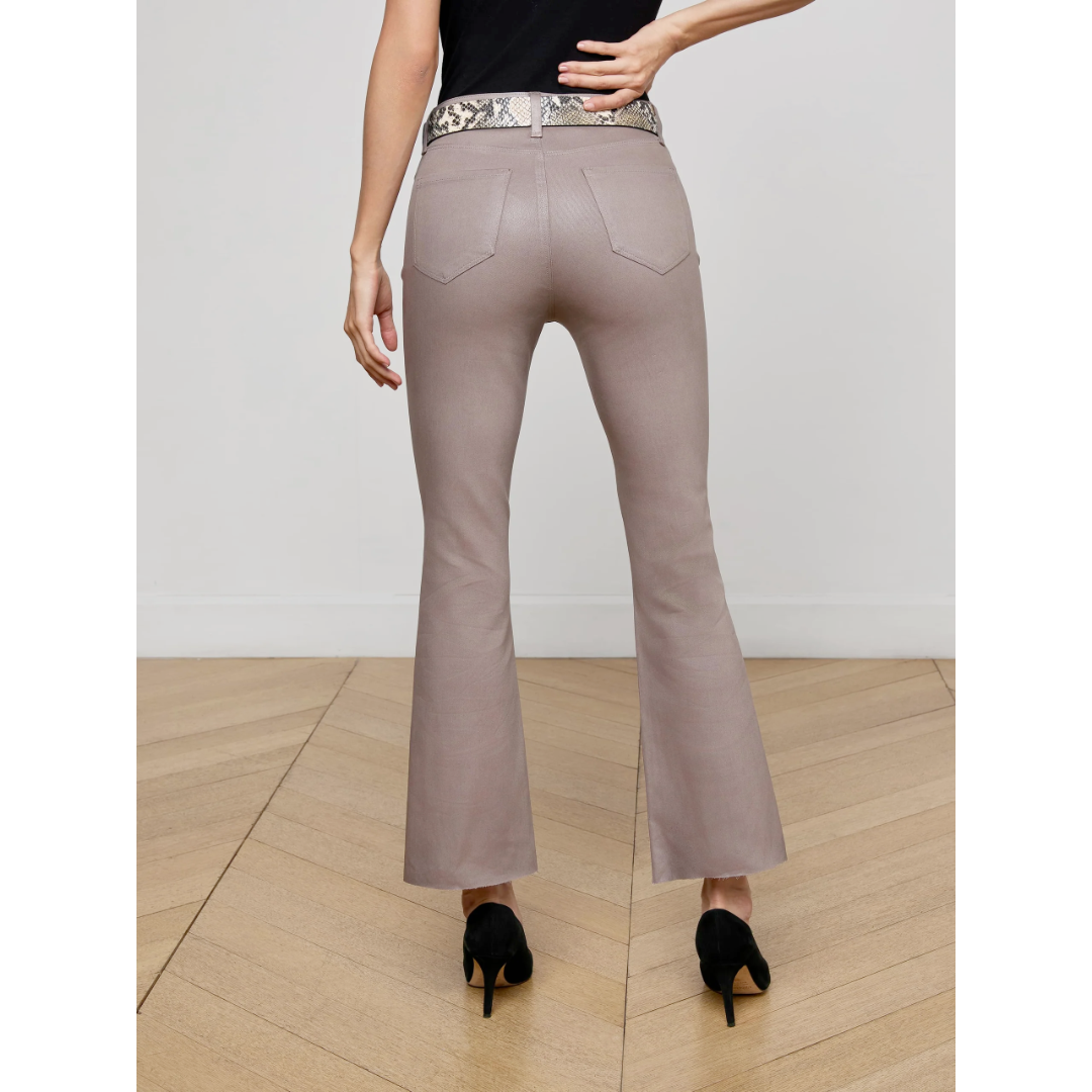 The perfect wear-now cropped flare jean, designed to be compatible with flats or heels. This beautifully proportioned kick flare is now back in light gray leather-alternative coated denim.