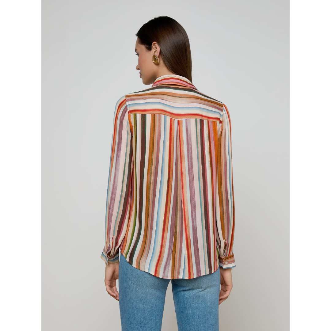 Our classic long-sleeve silk button down. This relaxed fit essential is now back in a chic multicolored stripe.