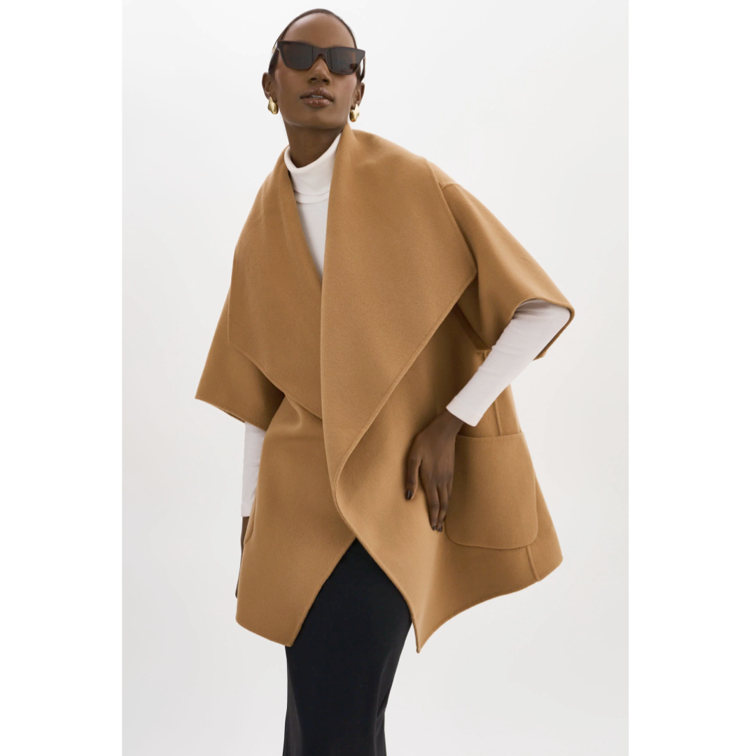 Make your top piece work for you. Featuring front patch pockets and a cascading drape front, the Penelope's wool body adds warmth and flair. ¾ sleeves invite your sleeves to peek out through the coat's oversized fit, creating a polished look from head to toe.