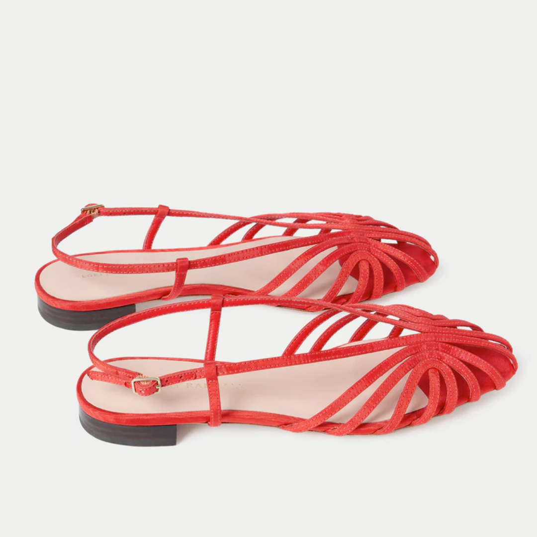 Flat sandal in red moiré. Features a latticed strap design, an adjustable slingback strap with a buckle closure, and a padded footbed with a gold-stamped logo.