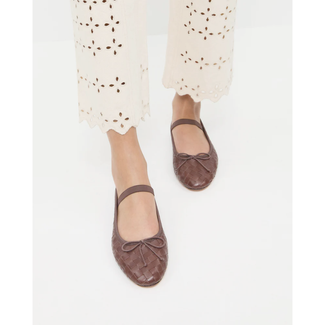 Soft ballet flat in espresso brown woven leather with an elastic bridge strap and bow detail. Features a padded footbed with gold stamped logo and an almond toe. Slips on.