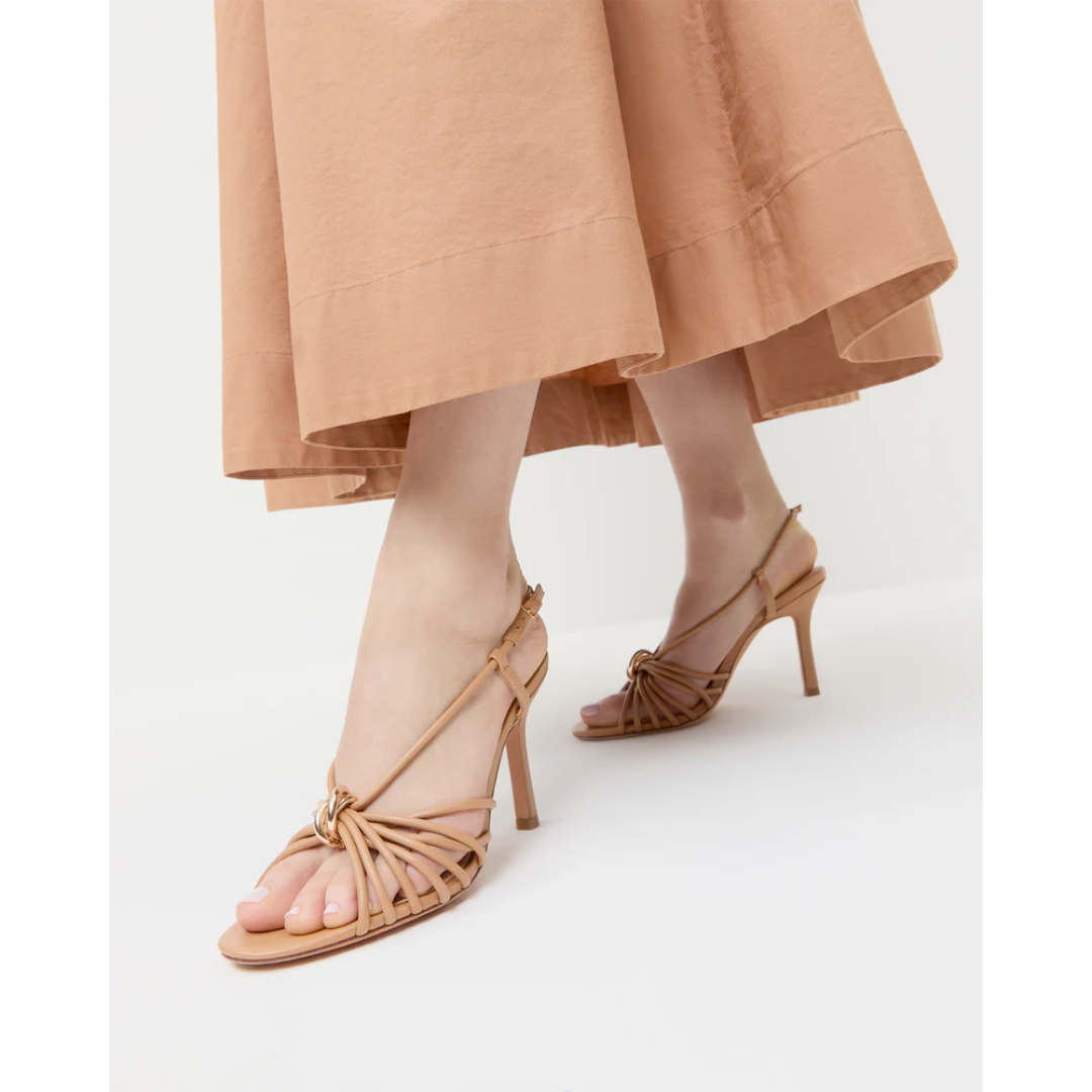 Strappy heeled sandal in dune nappa leather with statement metallic ring hardware. Features an open toe, an adjustable sling-back strap with a buckle closure and a padded footbed. 3.5-inch heel.