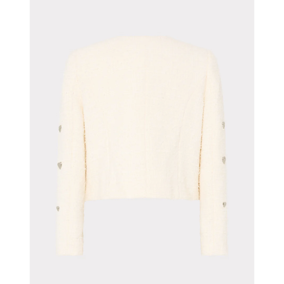 Rendered from a cream-colored, wool blend bouclé fabric, this boxy cut jacket is embellished with evenly appointed silver metal heart appliqué throughout.
