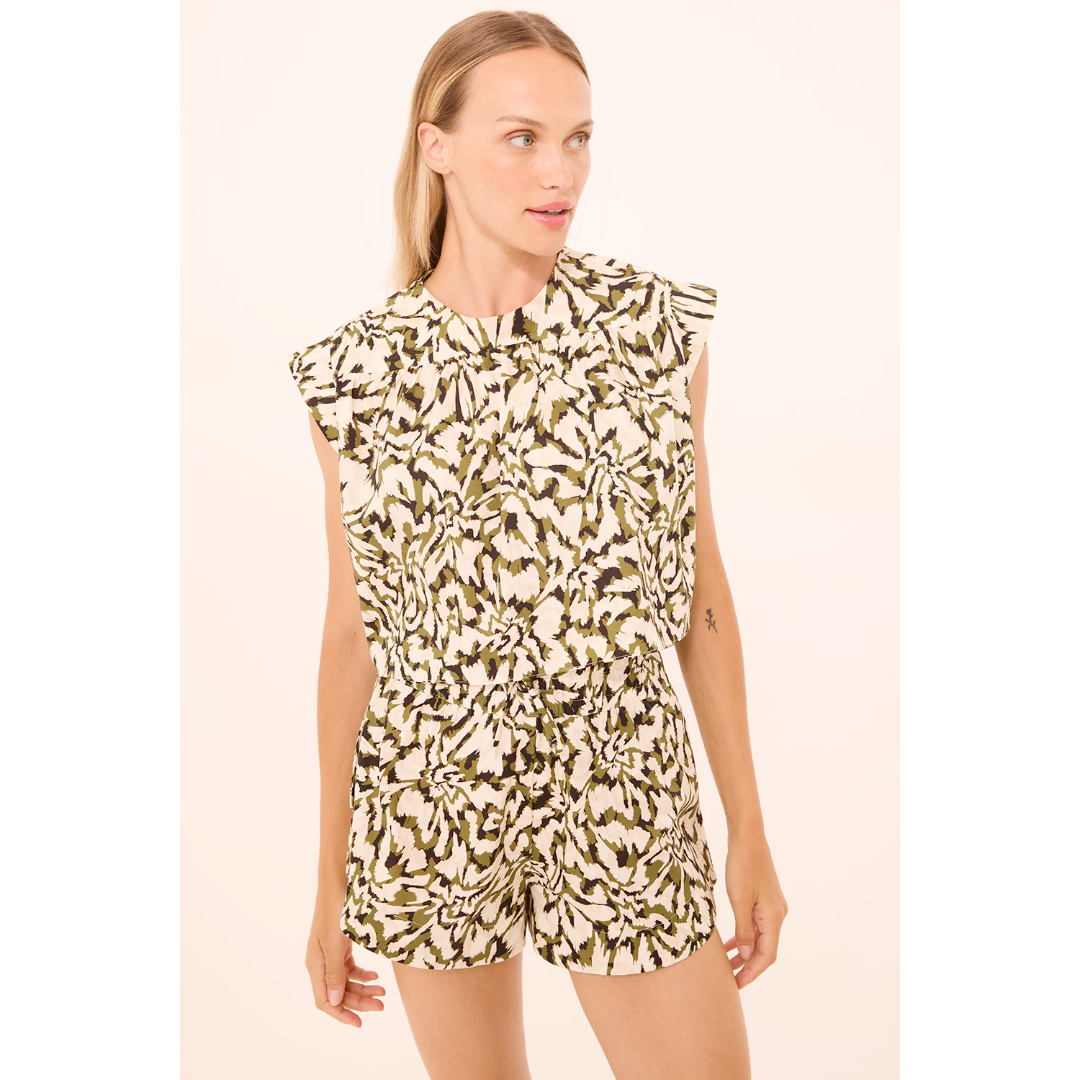 Alina is a new cropped top cut from green and black Abstract Floraburst printed cotton poplin on a cream ground. This boxy silhouette features a high neckline, cap sleeves, and a keyhole button closure at the back. A slightly longer back hem adds an easy, relaxed finish. Pair with the coordinating Itzel skirt for a breezy pre-spring set or with the Noah short for an effortless warm-weather look.