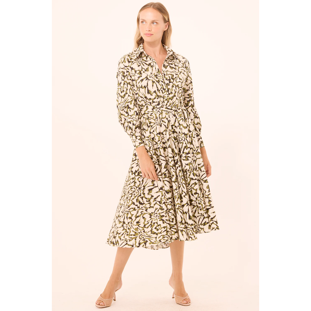 The Lorie dress is a perfect daytime midi cut from abstract Floraburst–printed cotton poplin. Designed in a classic shirt-dress silhouette, it features a foldover collar with covered button closure to the waist, long sleeves with triple-button cuffs, and an optional self-tie belt. A full, feminine pleated skirt adds movement and ease. Style it with heels or pair it with a chic ballet flat for effortless daytime wear.