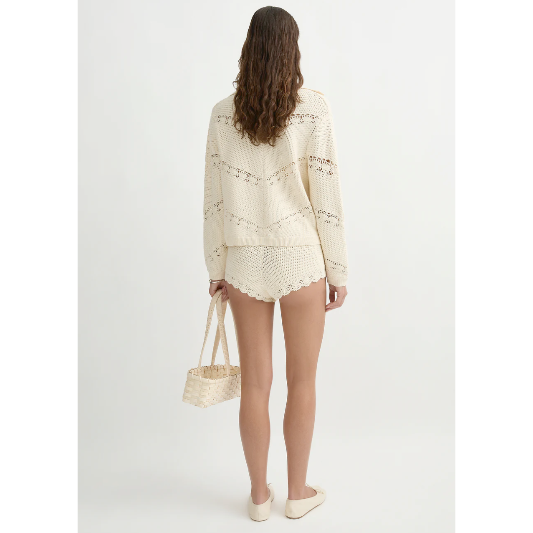 The Dylan Cardigan features a soft open collar and hand-crocheted detailing through the body.