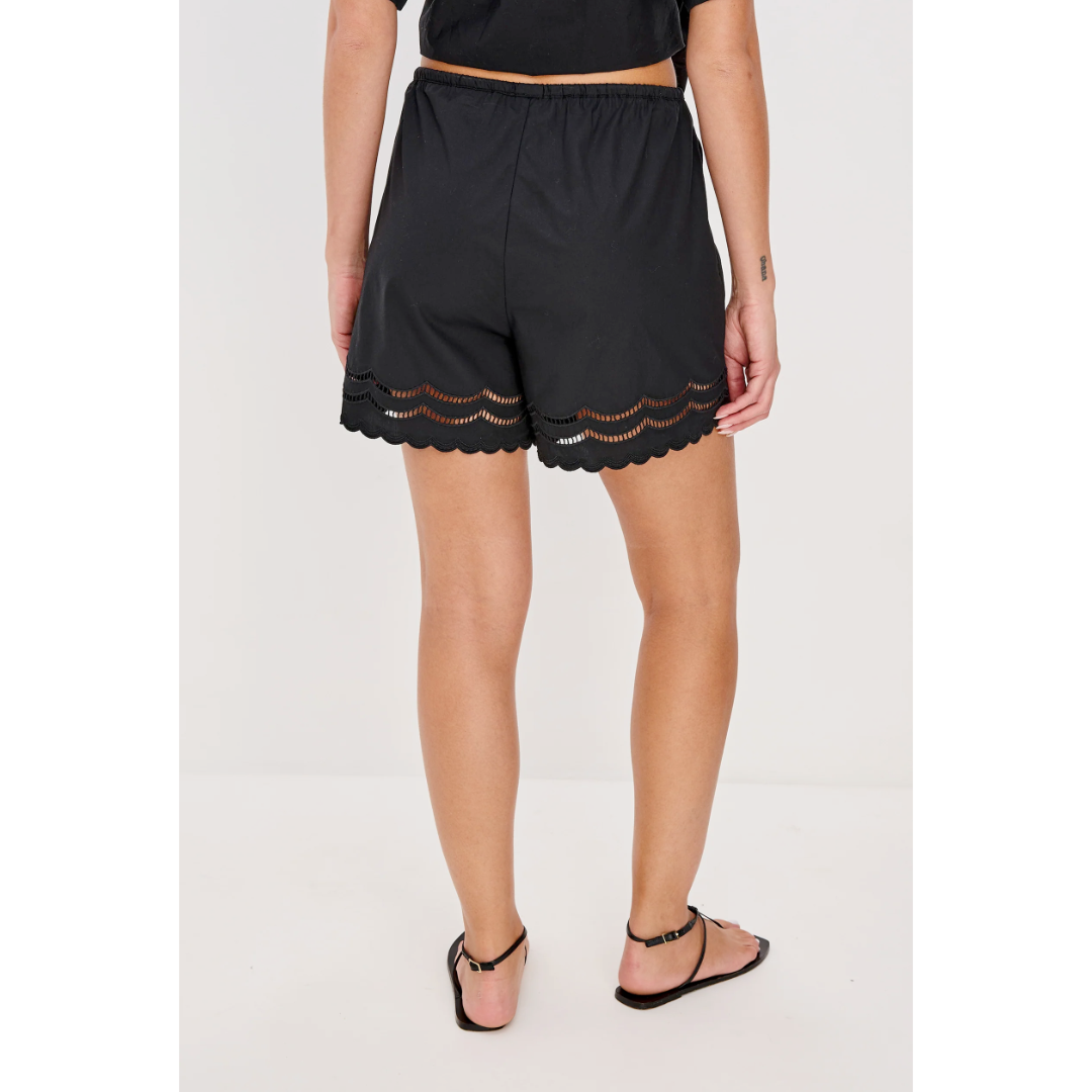 Effortless to slip on, the Armanda is a high-rise short in crisp, lightweight poplin, featuring tasseled drawcord ties, a relaxed fit, and scalloped ladder embroidery at the hem.