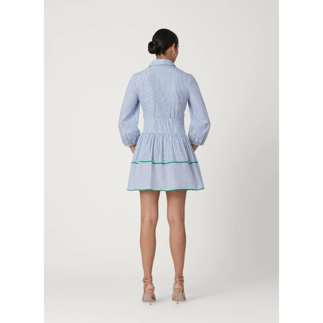 This striped poplin mini dress features a hidden button front placket and three-quarter length balloon sleeves. Elastic casing at sleeve opening. Beautiful contrast binding at the skirt and an adjustable waist tie. Elastic at the back waist allows for an adjustable fit. Unlined.