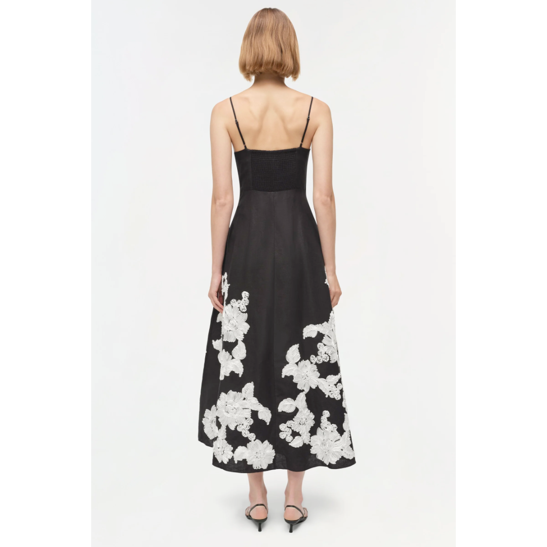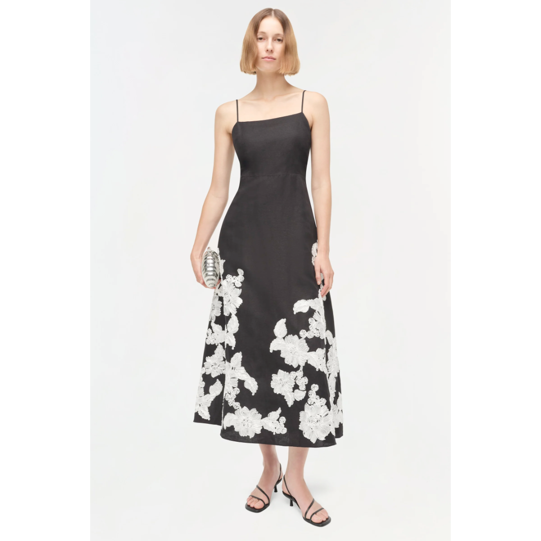 Crafted from a structured yet breathable linen blend, this dress is traced with delicate soutache embroidery that contrasts its clean lines. Cut to a flattering midi length, the silhouette is finished with a delicate cami neckline for an effortless, refined mood.