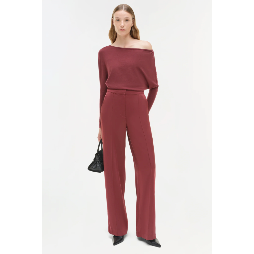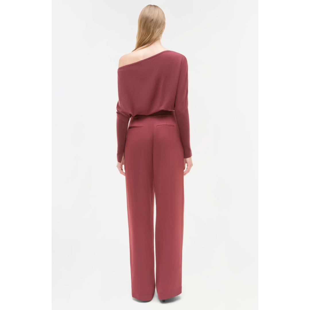 A wide leg woven satin pant with a clean front seam and welt back pockets.