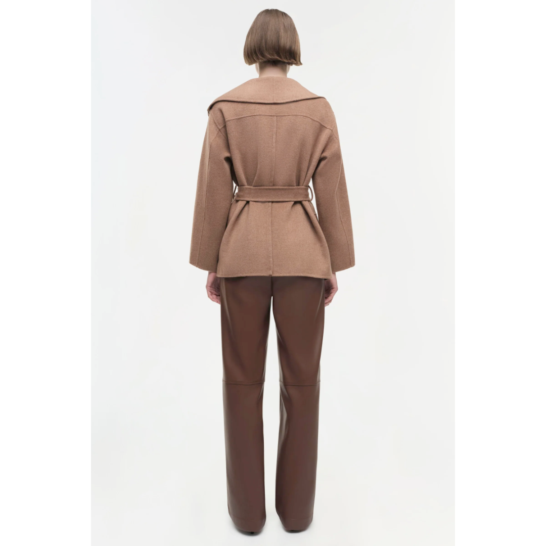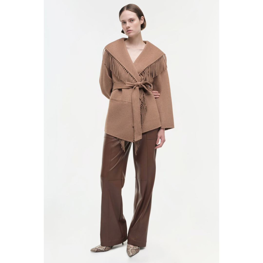 Our Signature Rowen Jacket in Camel. This fringe overpiece boasts a modern take on classic Western style with its bold, dramatic fringes along the chest and back. The belted waist adds a touch of structure, making it a standout piece for any wardrobe.