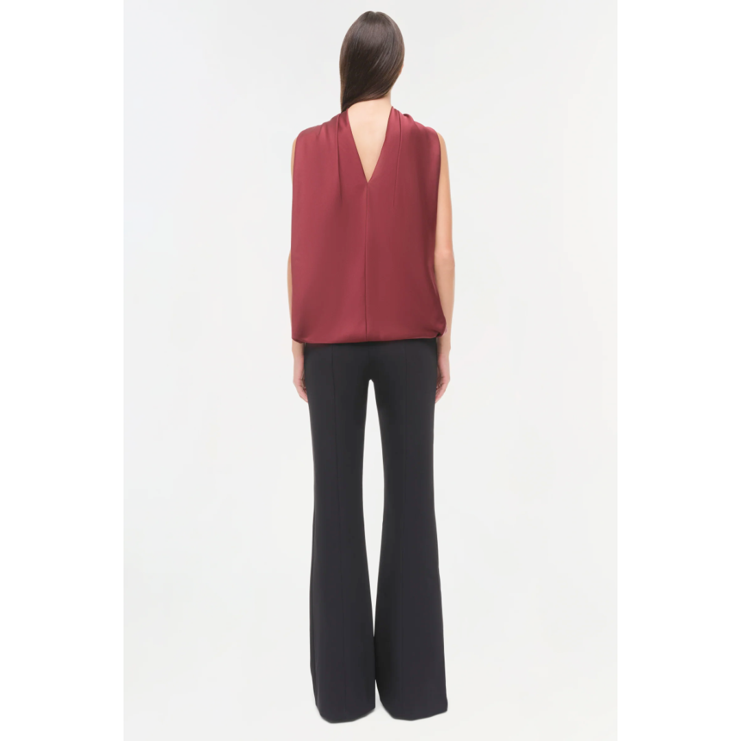 A draped satin cape top with a high neckline that gathers into controlled folds, releasing into a graceful back drape that falls with ease. Minimal yet striking, it captures the balance of movement and form.