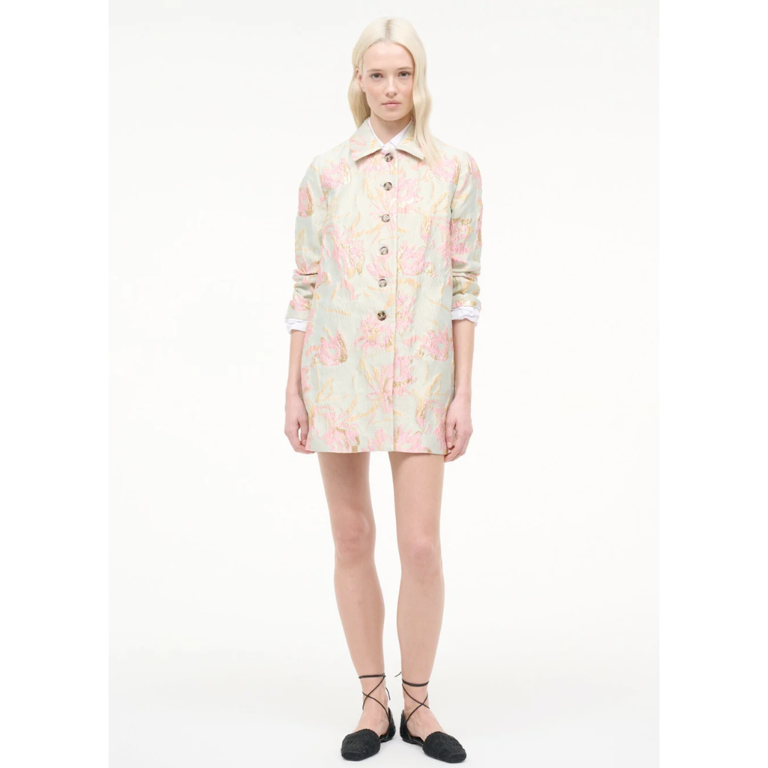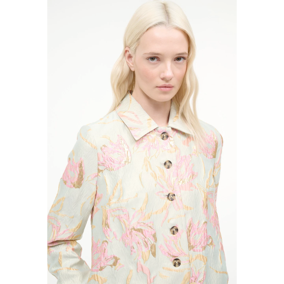 Elevate your outfit with this floral metallic brocade jacket, featuring striking contrast buttons that add dimension and polish. Designed to coordinate seamlessly with the matching Mimi Dress, it's the perfect layering piece.