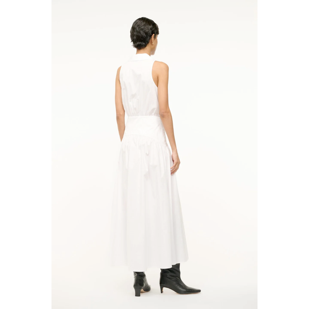 The Romy Dress is a sleeveless update to our best-selling Rocco Dress; featuring a classic collar and front button detail, this style has slight ruching at the waist and a curved yoke detail at the hip.