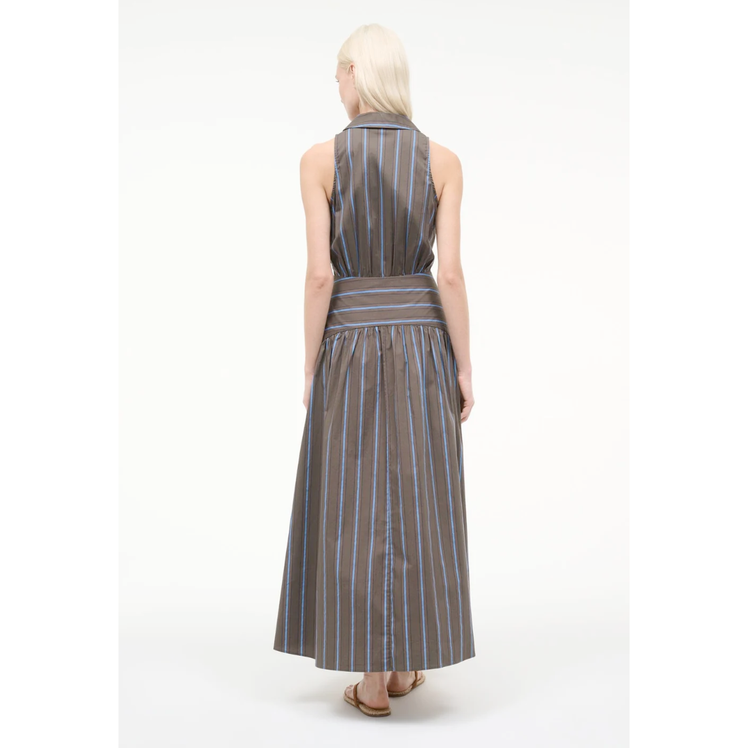The Romy Dress is a sleeveless update to our best-selling Rocco Dress; featuring a classic collar and front button detail, this style has slight ruching at the waist and a curved yoke detail at the hip.