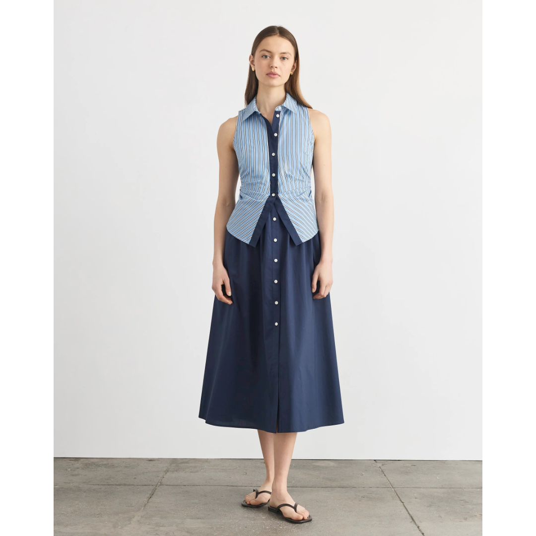 Product details: • Midi length• Collared• Sleeveless• Cinched waist• Lined bodice• Self-tie at back• Cotton stripe shirting• Button up front• On seam pockets• Hidden side seam zipperFit Details:• True to size• Franci is 5’10” and wears a size 2• Dress is 51" from high point shoulderMaterials & Care:• 100% Cotton• Dry clean only