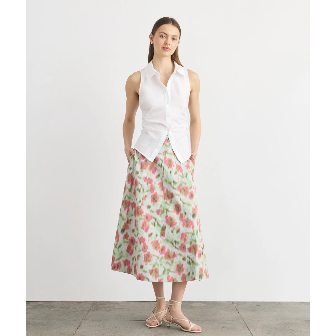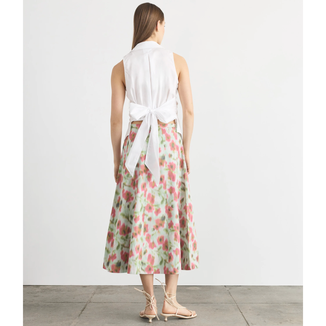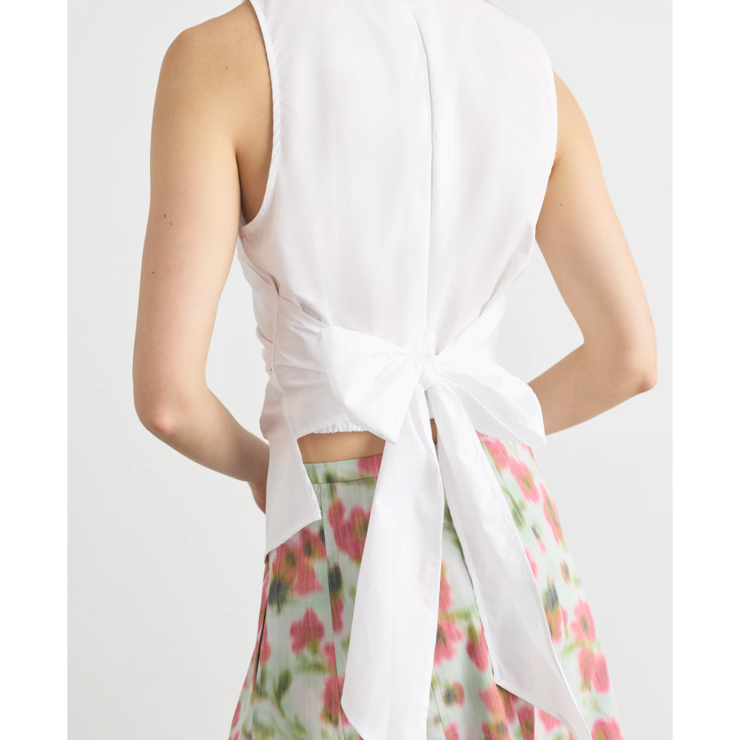 Product Details:• Collared• Sleeveless• Front angled hemline• Elastic at back hem• Cinched waist• Self-tie at back• Unlined• Cotton shirting• Button upFit Details:• True to size• Franci is 5’10” and wears a size 2• Top is 25" from high point shoulderMaterials & Care:• 100% Cotton• Dry clean only