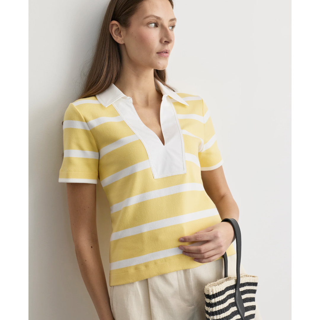 Designed in an organic rugby stripe and featuring a contrasting v-neck and collar, Melanie adds a playful polish to any look.