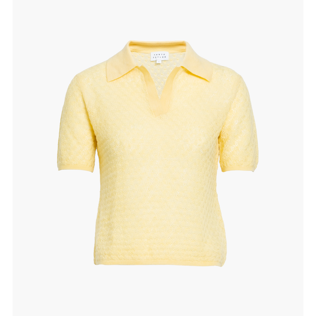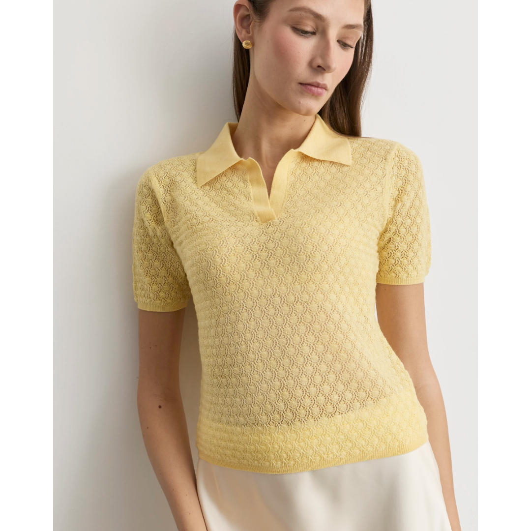 Product Details:• Collared v-neck• Short sleeve• Unlined• Extrafine merino wool• Pointelle detail body and sleeves• 3/4 length button up• Pull onFit Details:• True to size• Agnes is 5’10” and wears a size XS• Top is 22" long from high point shoulderMaterials & Care:• 100% Extrafine Merino Wool• Dry clean only
